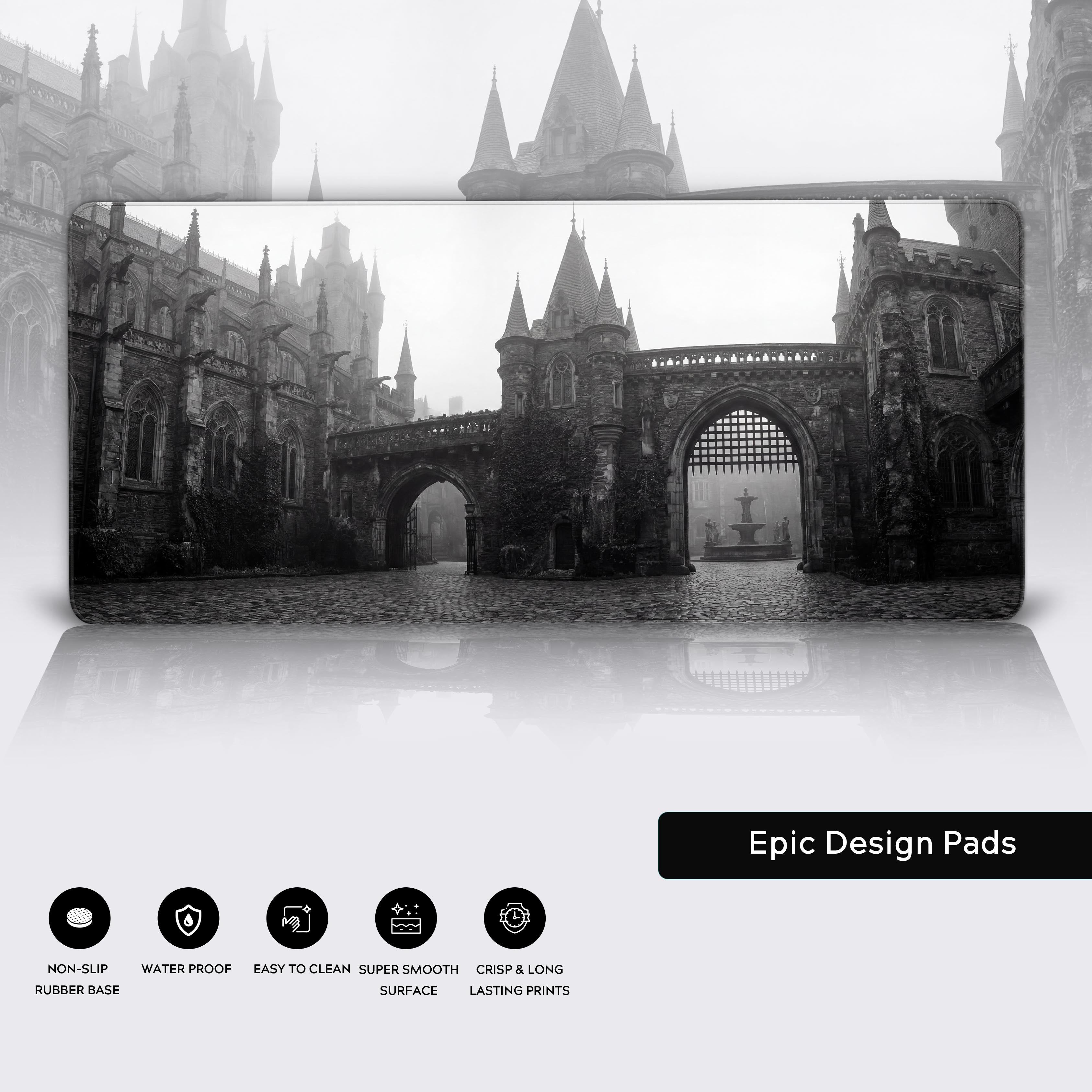 Transform your desk into a gateway to a world of dark romanticism and quiet introspection with the Gothic Courtyard desk mat. This design captures the weight of centuries, where misty archways and cobblestone paths whisper secrets of the past. It's the perfect backdrop for a mind that finds beauty in the somber and the ancient.