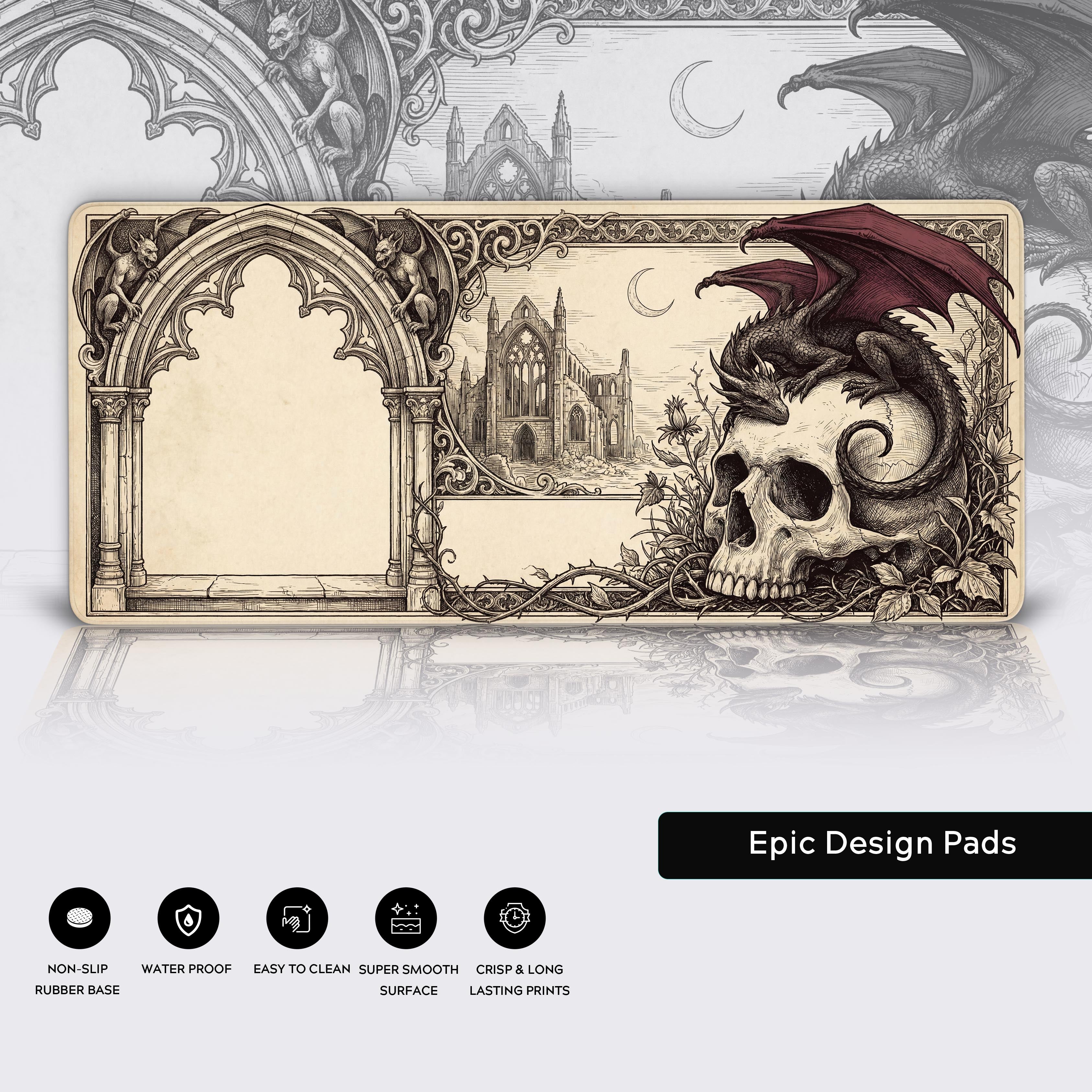 Step into a world of forgotten lore with the Gothic Remnant desk mat. This design captures the beautiful melancholy of a lost age, featuring a crimson-winged drake perched upon a weathered skull—a true study in memento mori. The vintage copperplate etching style, complete with crumbling gothic ruins and ornate archways, adds a layer of sophisticated gloom to your workspace.