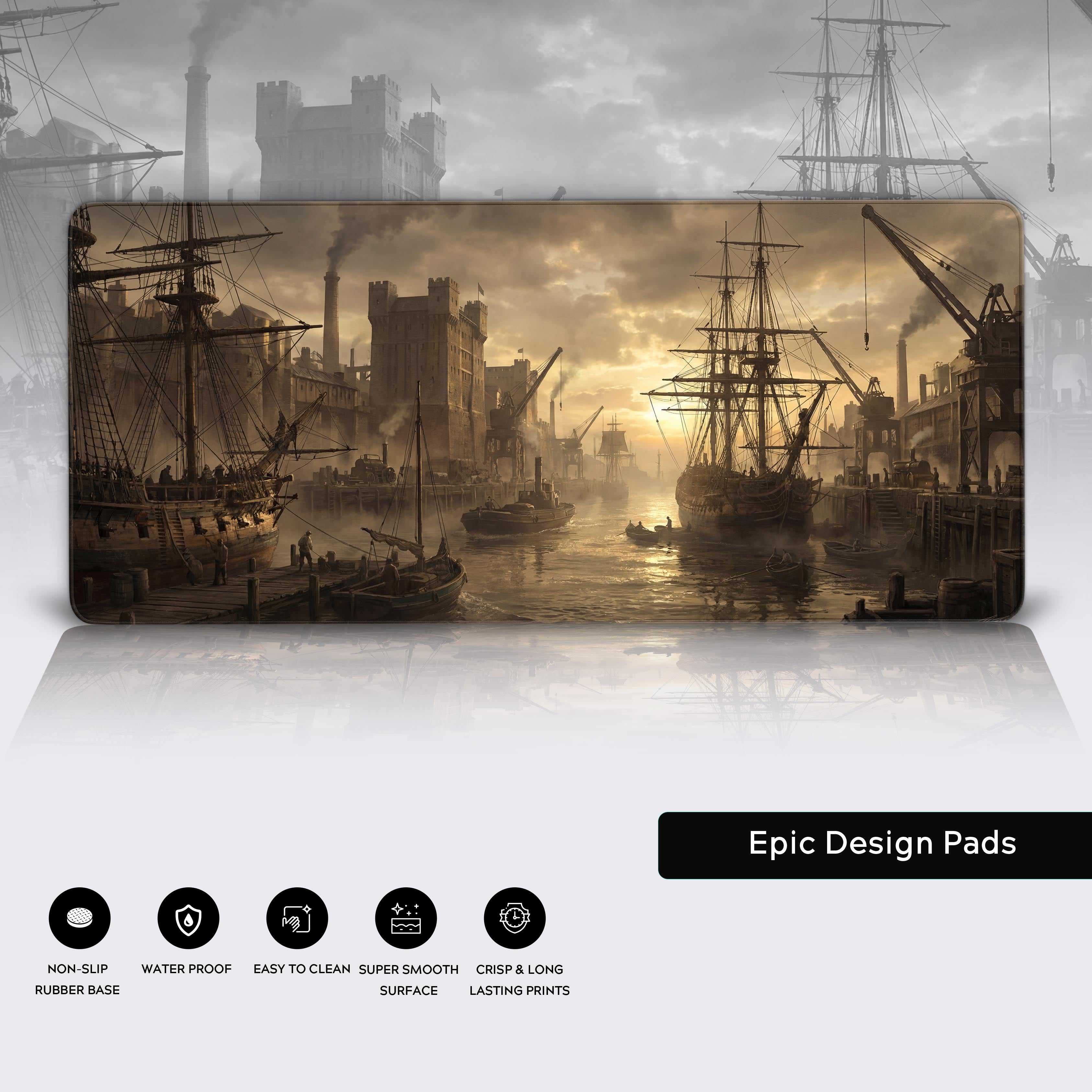 Capture the pivotal moment where sail meets steam with the Industrial Dawn desk mat. This design isn't just a scene; it's a statement. Towering masts of a bygone era stand against the encroaching might of industrial smokestacks, all bathed in the golden, smog-tinged light of progress. It's a tribute to the grind, the transition, and the gritty beauty of commerce.