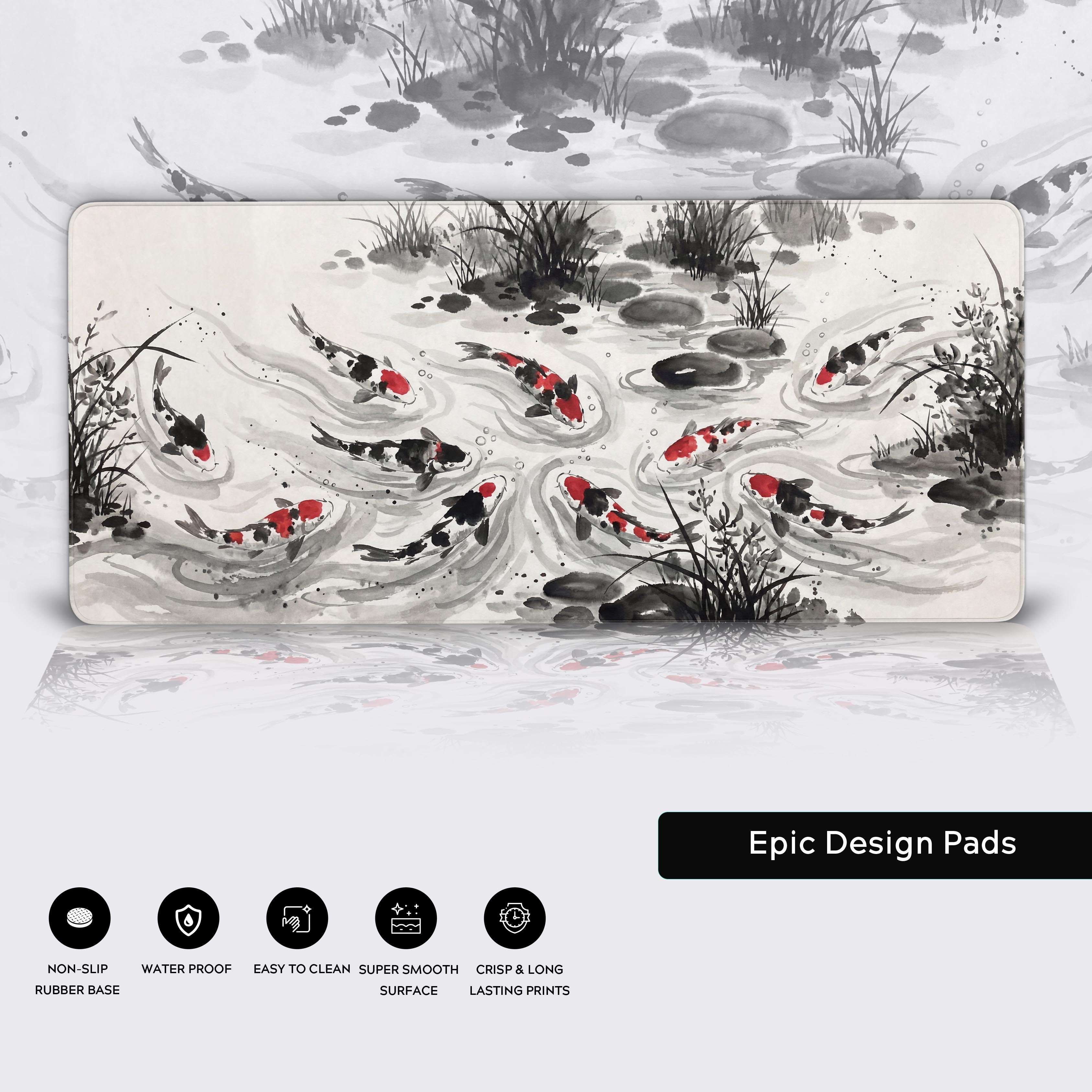 Transform your desk into a personal Zen garden with the Ink Flow desk mat. Inspired by the ancient art of Sumi-e ink wash painting, this design captures the spirit of Koi fish navigating a swirling current—a powerful symbol of perseverance and courage.