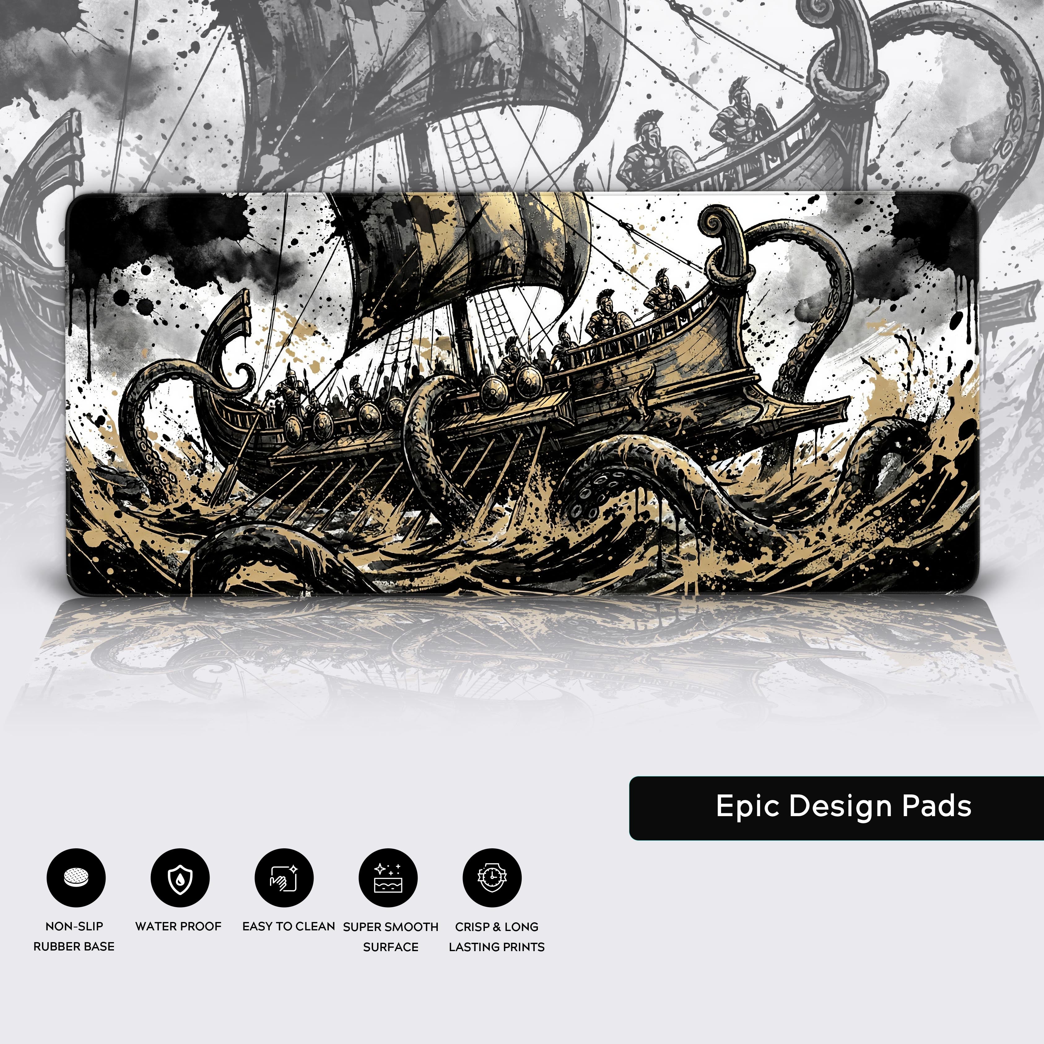 When chaos erupts, do you sink or do you fight? The Kraken's Grasp desk mat captures that defining moment—a visceral clash between an ancient warship and a monstrous kraken, rendered in stark black and gold ink. This isn't just art; it's a statement of resilience.