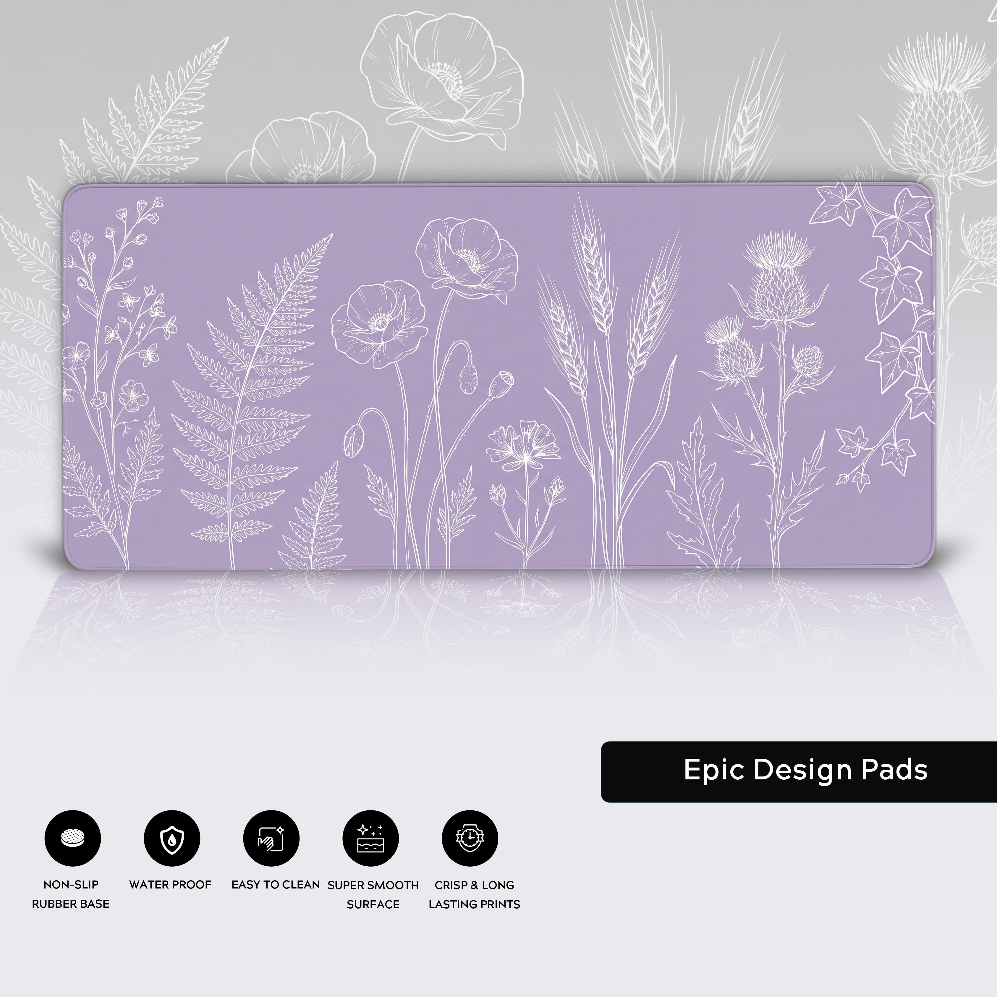Transform your chaotic workspace into a sanctuary of calm with the Lavender Botanica desk mat. This design isn't just a pretty floral pattern; it’s a tribute to nature's quiet strength, featuring delicate white line art of resilient thistle, ancient fern, and life-sustaining wheat against a soothing lavender canvas.
