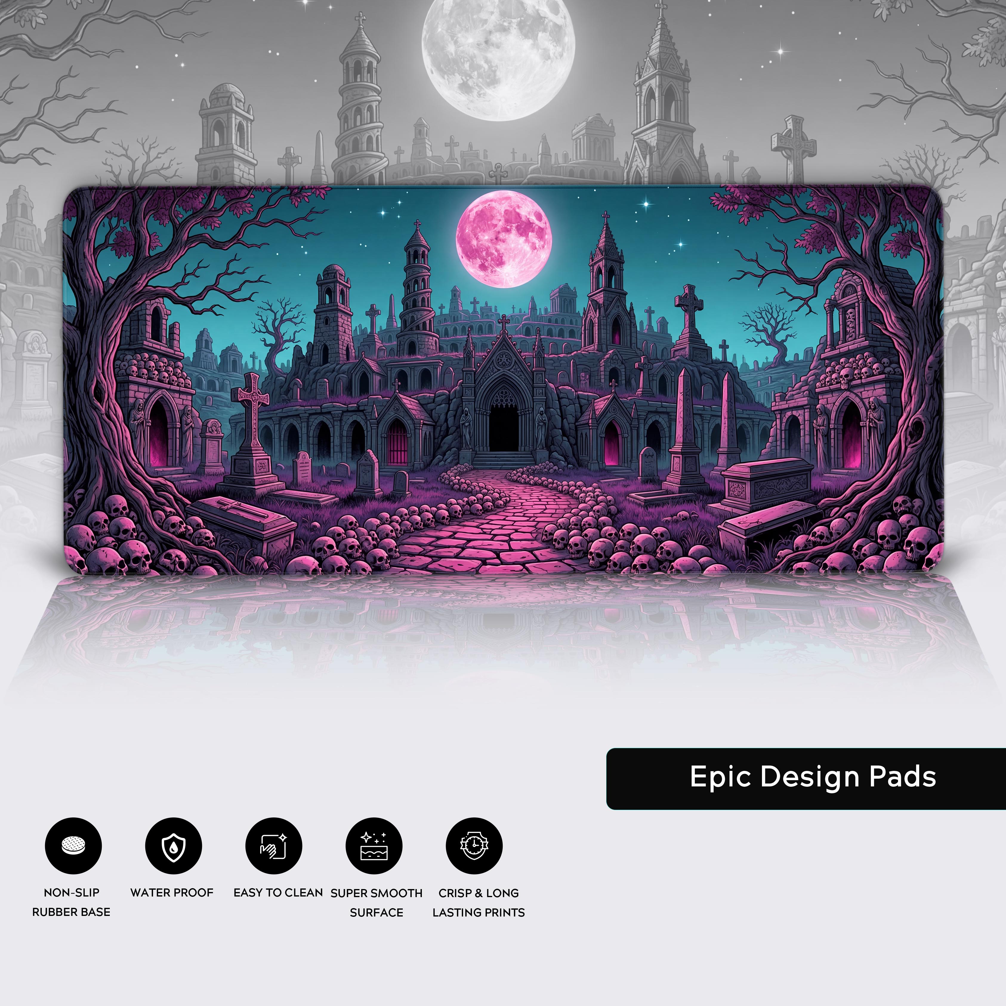 Ditch the minimalist trend and plunge your desk into a realm of unapologetic darkness with the Lunar Boneyard desk mat. This isn't just a graveyard scene; it's a neon necropolis under a toxic magenta moon, designed for those who command their space. Let the skull-paved path leading to the looming gothic cathedral be a daily reminder of the grind you conquer.