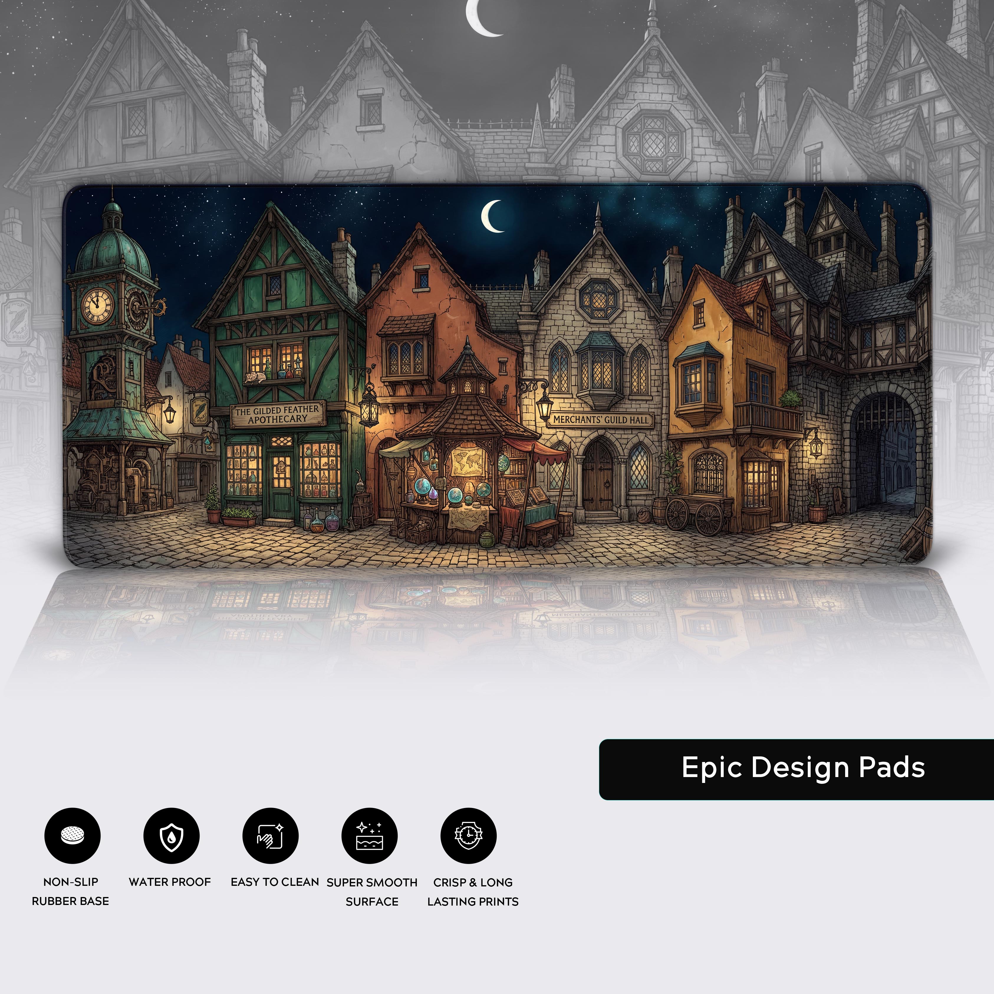 The warm lantern light from the Apothecary and Merchants' Guild Hall creates a sanctuary for deep focus, whether you're planning your next campaign, coding a new project, or grinding out daily tasks. Beyond the stunning visuals, this mat offers practical advantages: