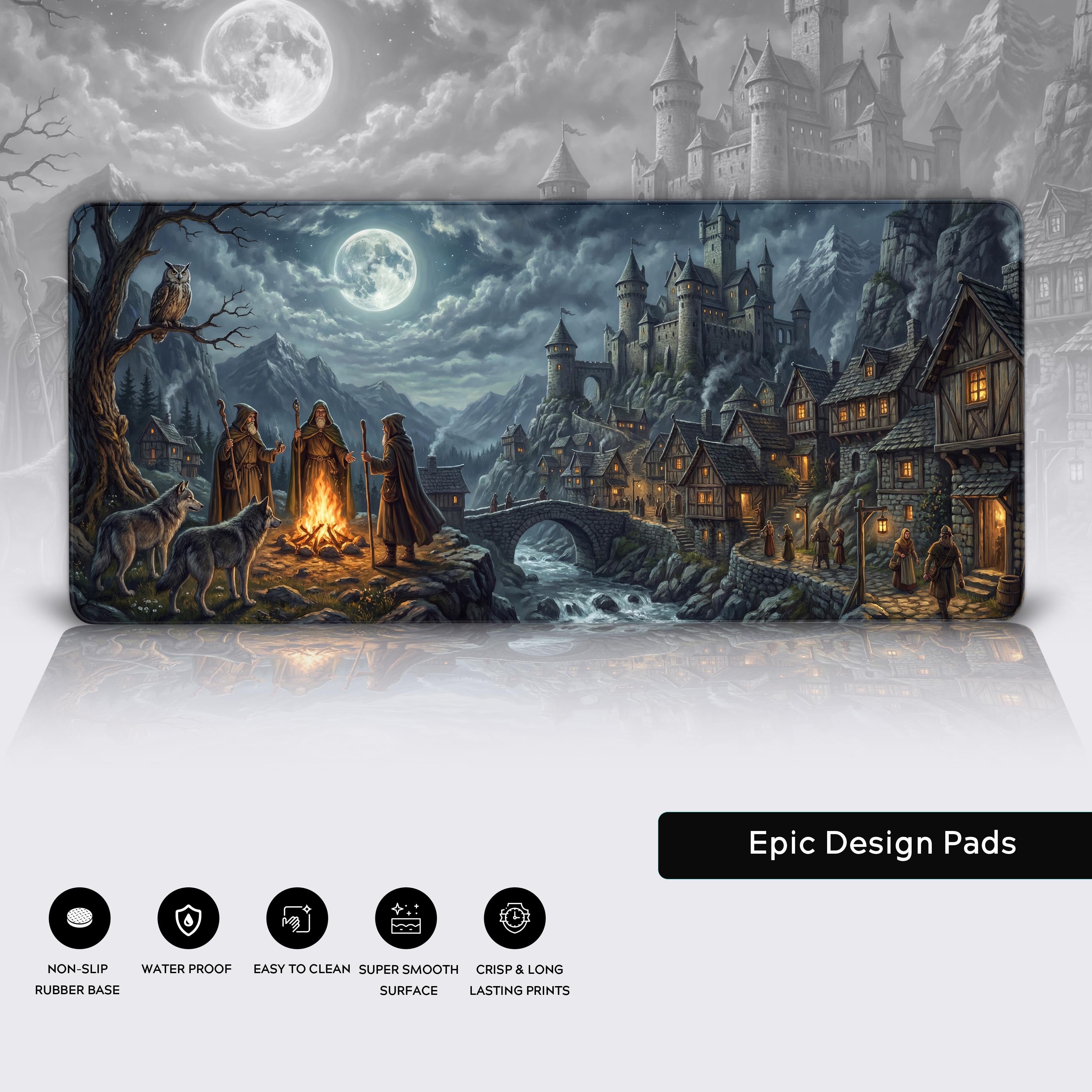 This is more than a desk mat; it’s a command center. Under a cold full moon, the Midnight Council convenes. Here, by the fire's glow and flanked by loyal wolves, true plans are forged away from the castle's prying eyes. This design is for the quiet strategist who understands that power is built in the shadows, not the throne room.
