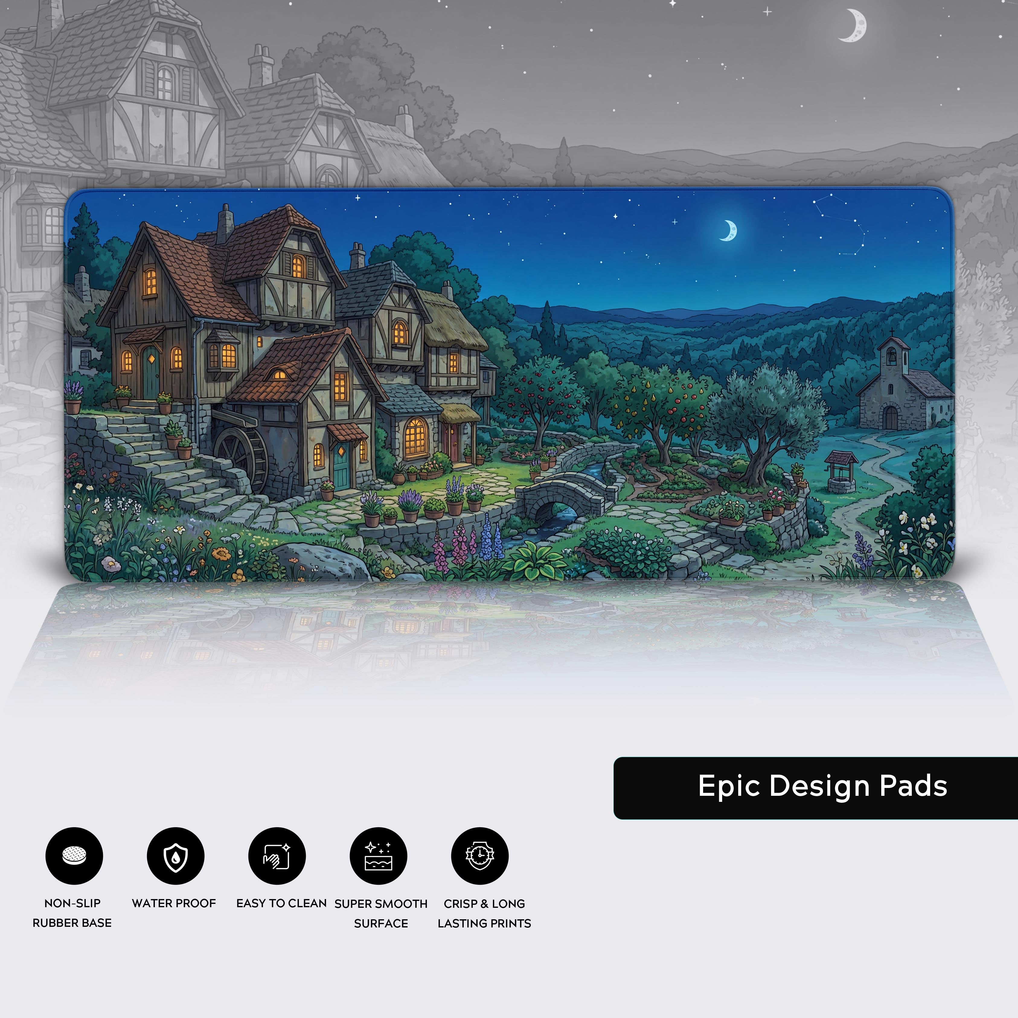 Escape the daily grind and find your resting point with the Midnight Hamlet desk mat. This design captures that deep relief of discovering a peaceful village after a long journey. The warm light from the tavern windows, the gentle sound of the water wheel, and the vast, starry sky create an atmosphere of pure sanctuary for your desk.
