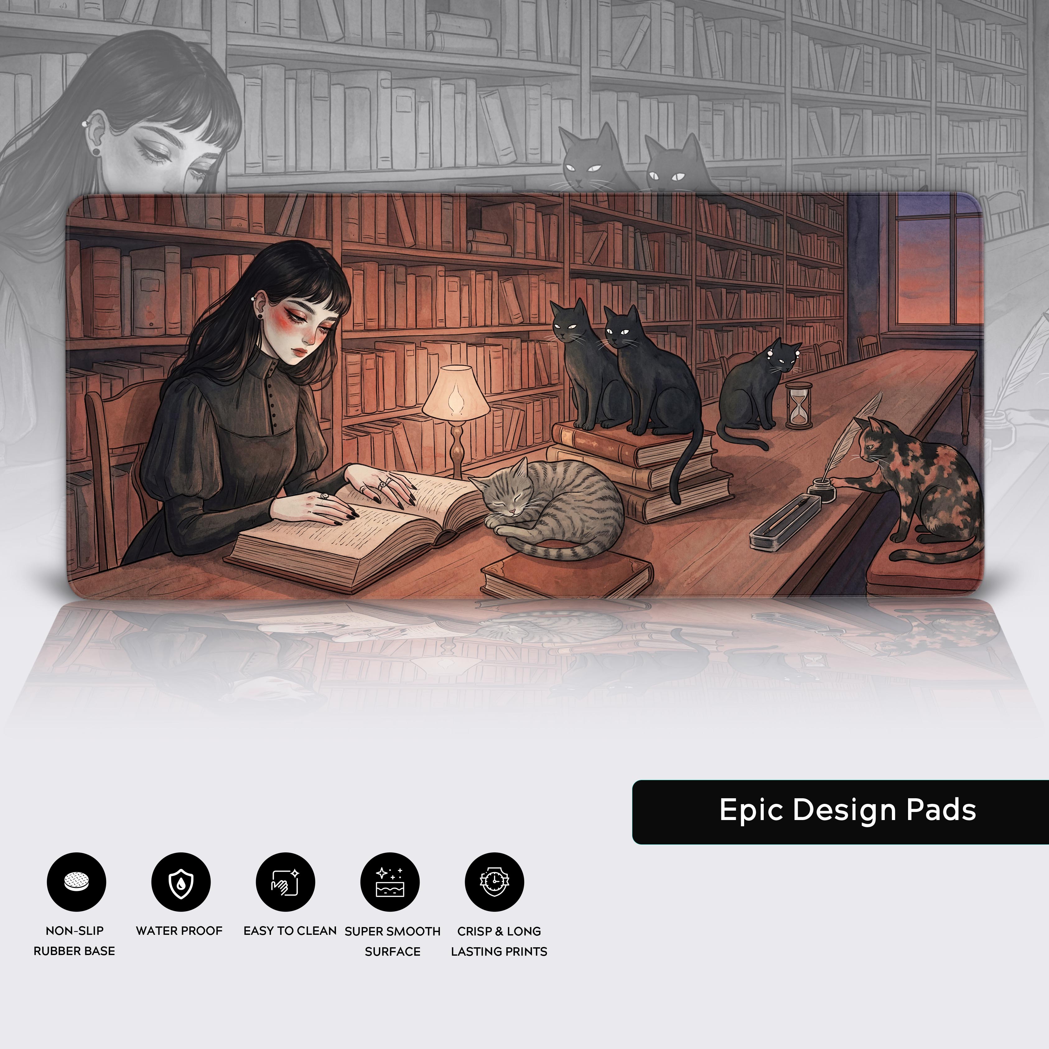 Escape the chaos of your daily workflow and enter the Midnight Library. This desk mat transforms your workspace into a haven for deep thought, creativity, and focus. The beautifully illustrated scene, featuring a quiet reader amidst towering bookshelves and feline companions, wraps your setup in an atmosphere of cozy solitude and intellectual calm.