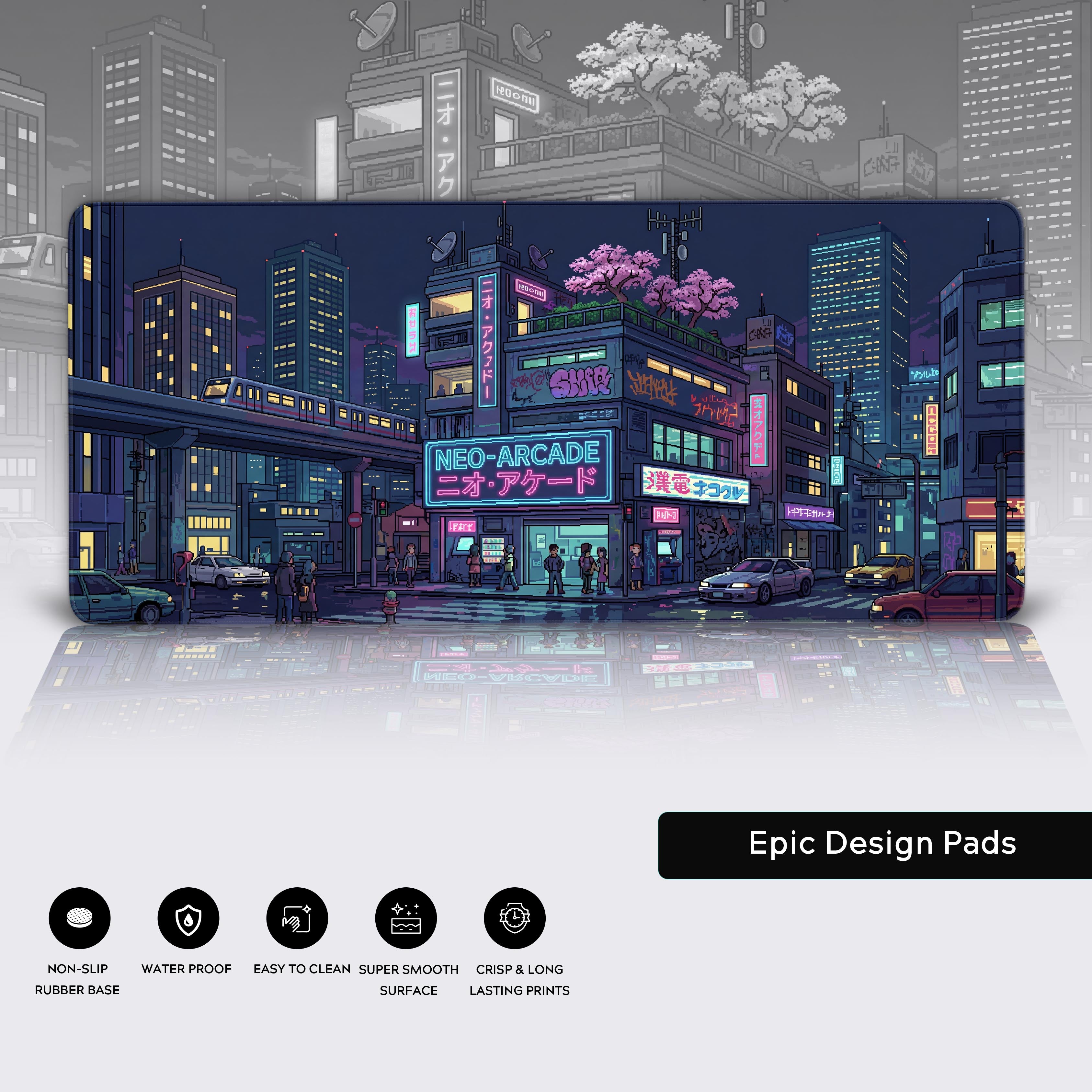 Inspired by the golden age of gaming, this mat blends chaotic urban energy with a unique, pixelated serenity. Every detail, from the passing monorail to the rooftop cherry blossoms, creates a nostalgic world that feels both futuristic and familiar.