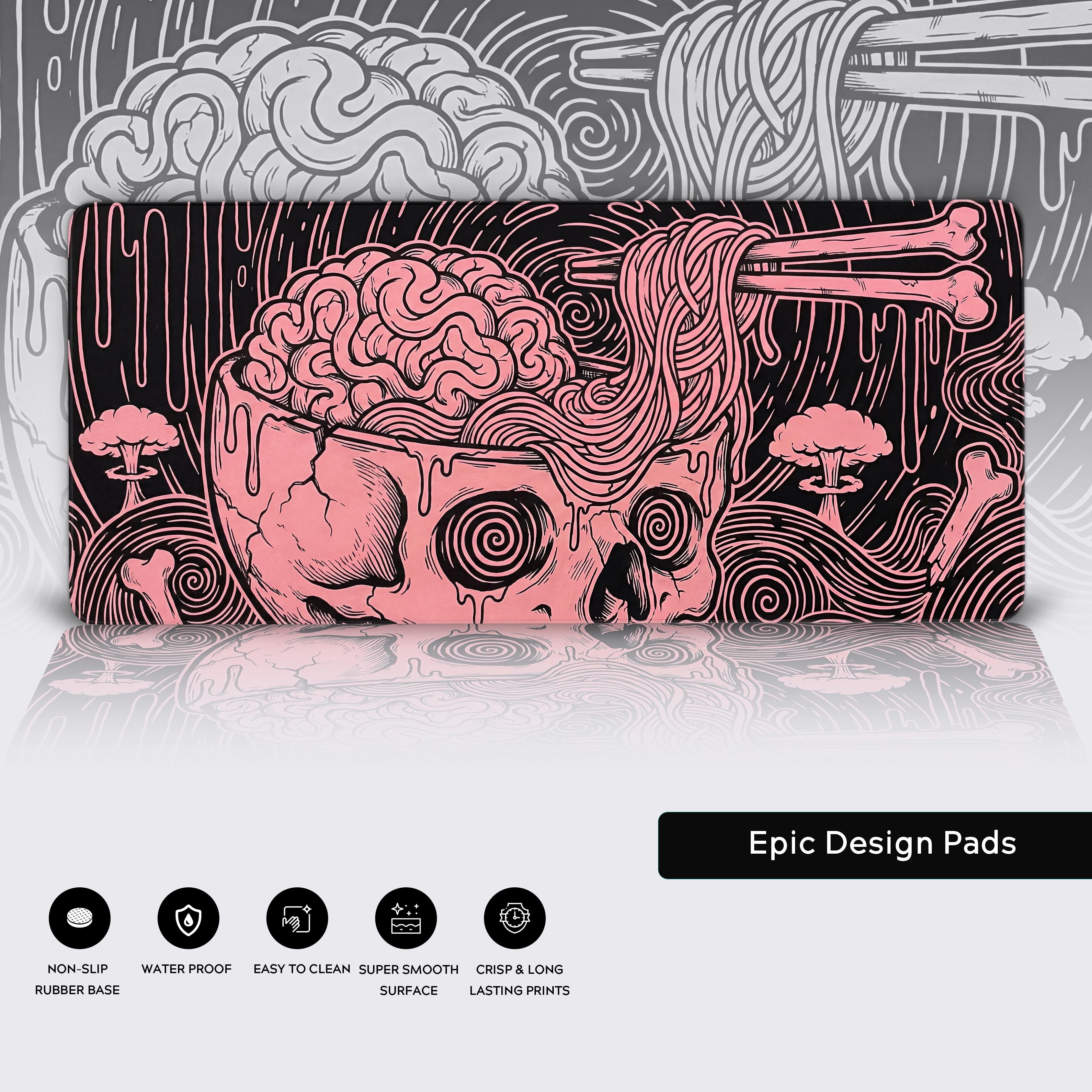 Is your desk just a surface, or is it a statement? The Mind Melt desk mat turns your workspace into a psychedelic canvas. This design captures the explosive nature of a big idea, depicting a skull serving brain-ramen with bone chopsticks. It’s weird, unapologetic, and hypnotic—perfect for the creative who thrives in the chaos of thought.