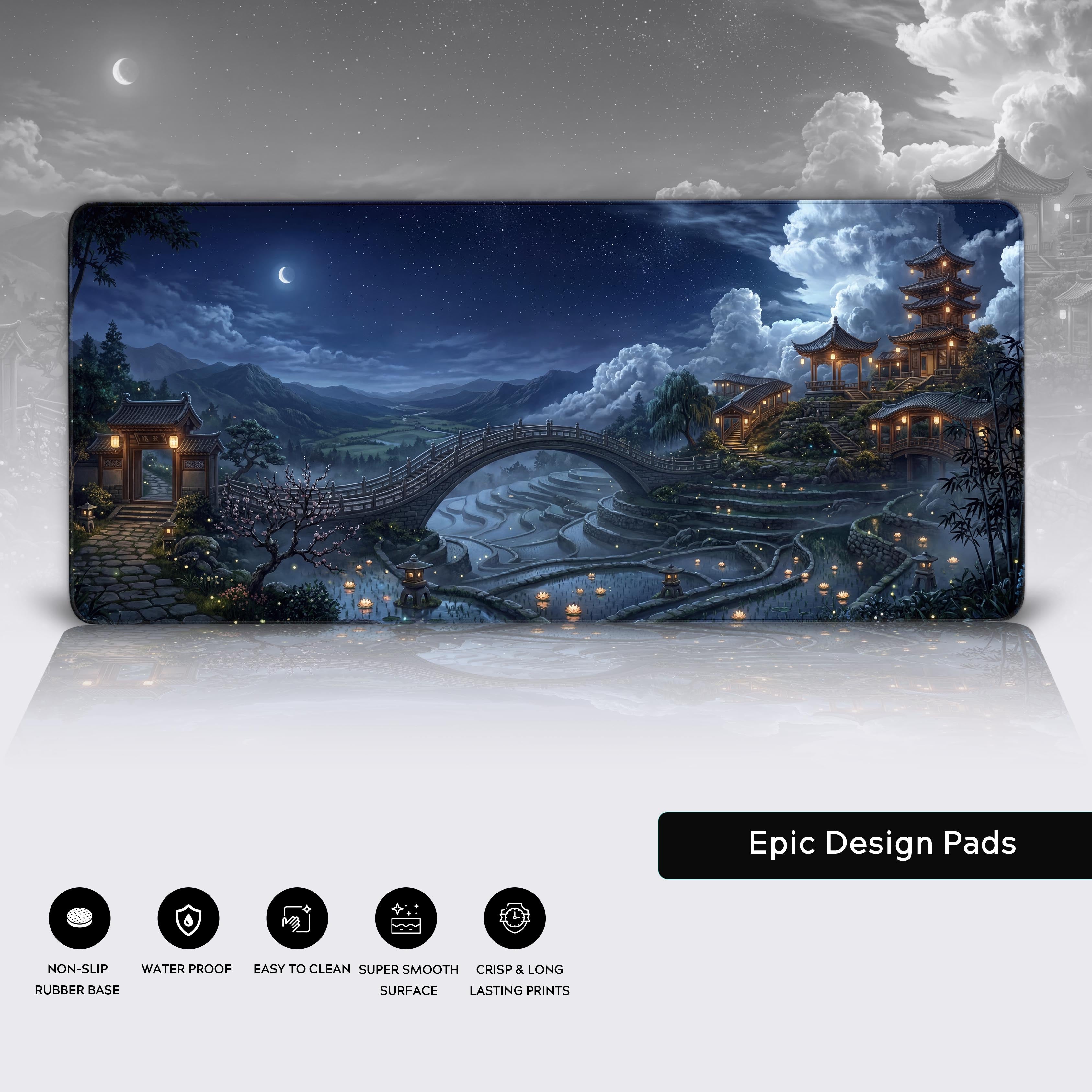 Is your desk a source of stress? Transform it into a portal of tranquility with the Moonlit Terraces desk mat. This atmospheric masterpiece grounds your workspace in a serene, ancient Eastern fantasy, helping you find focus late into the night.