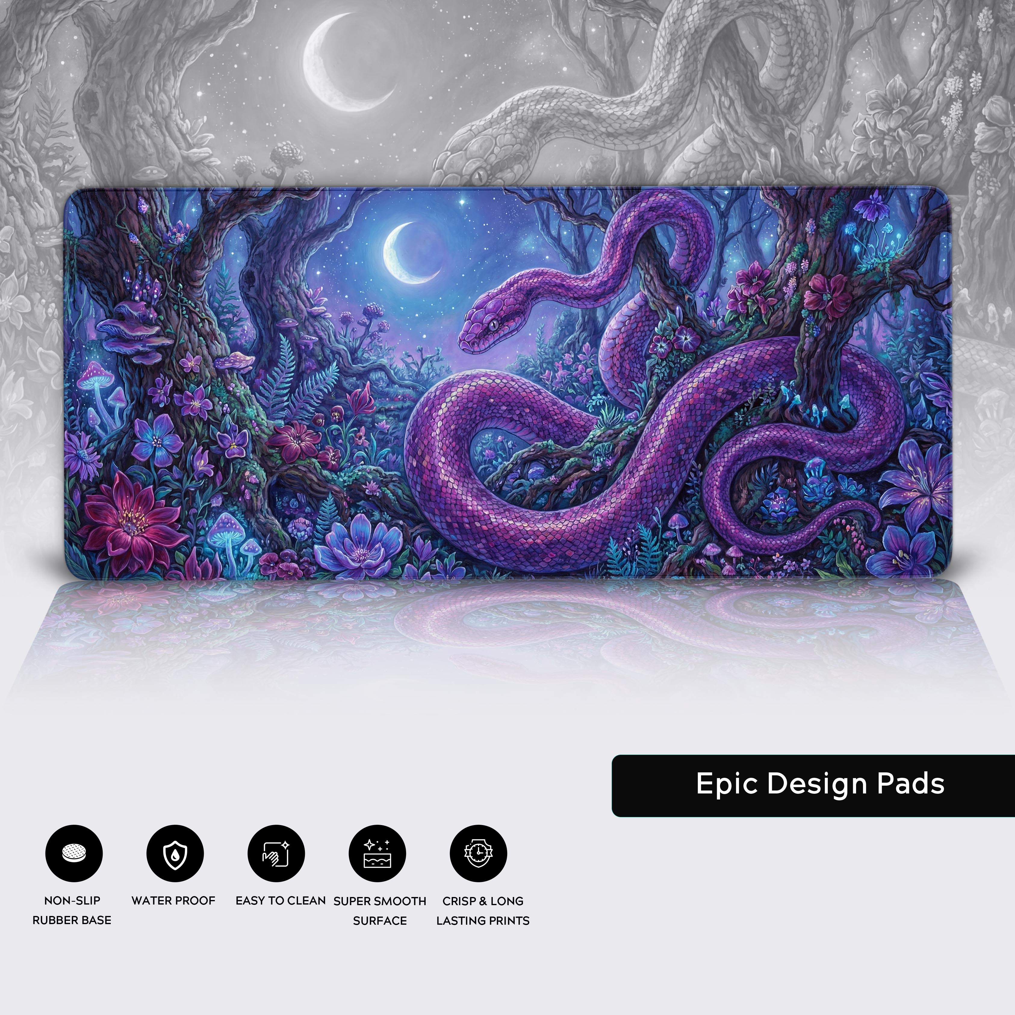 Transform your workspace into a sanctuary of mystery with the Mystic Serpent Desk Mat. This stunning design features a majestic purple serpent coiled through a moonlit, bioluminescent forest, guarding ancient secrets under a starry sky. It's an invitation to a world that awakens when the rest of civilization sleeps.