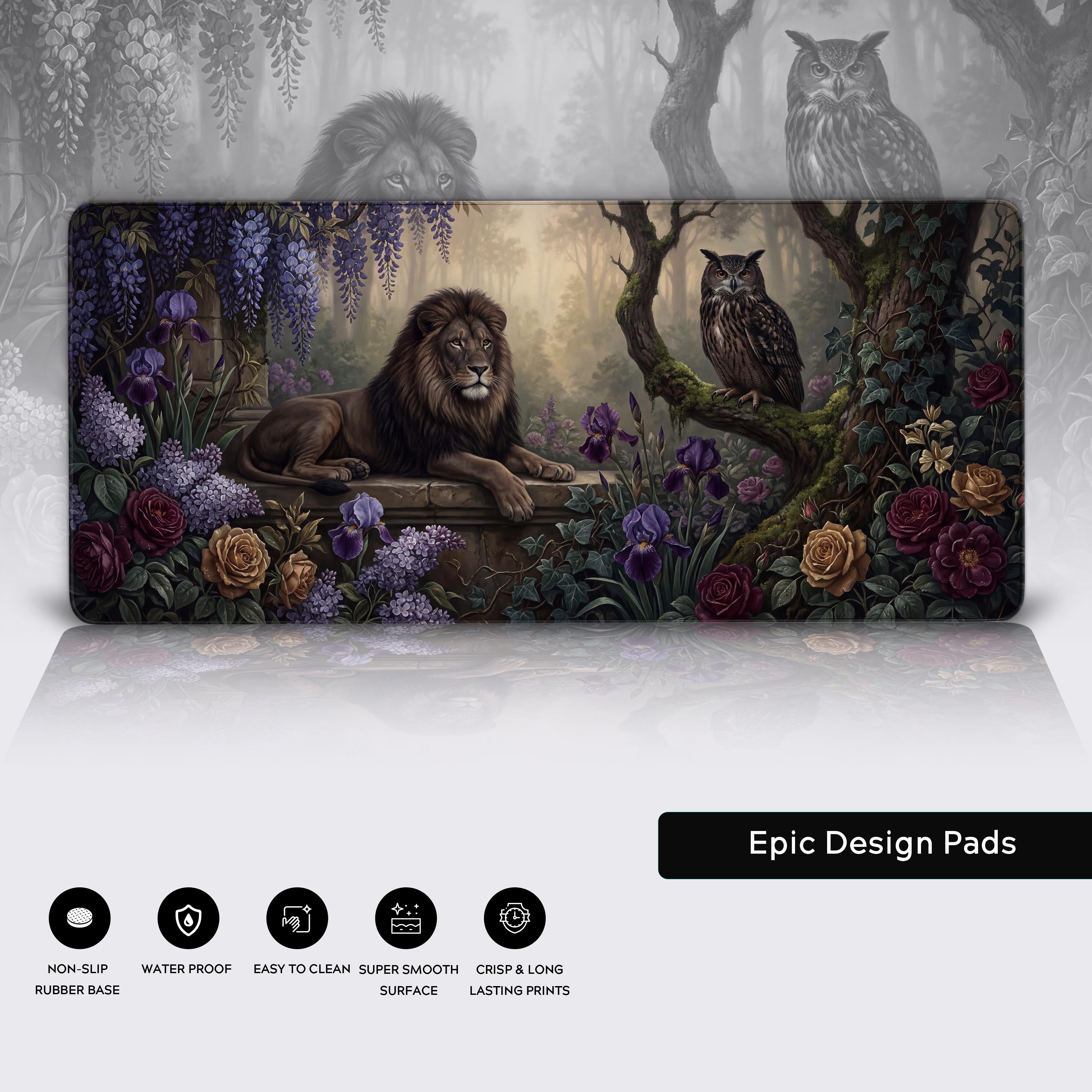 Transform your workspace into an enchanted sanctuary with the Mystic Wardens desk mat. This stunning design features a majestic lion resting on ancient ruins and a watchful owl perched in an overgrown, moonlit forest. It's a daily reminder to command your tasks with both fierce courage and calculated insight.