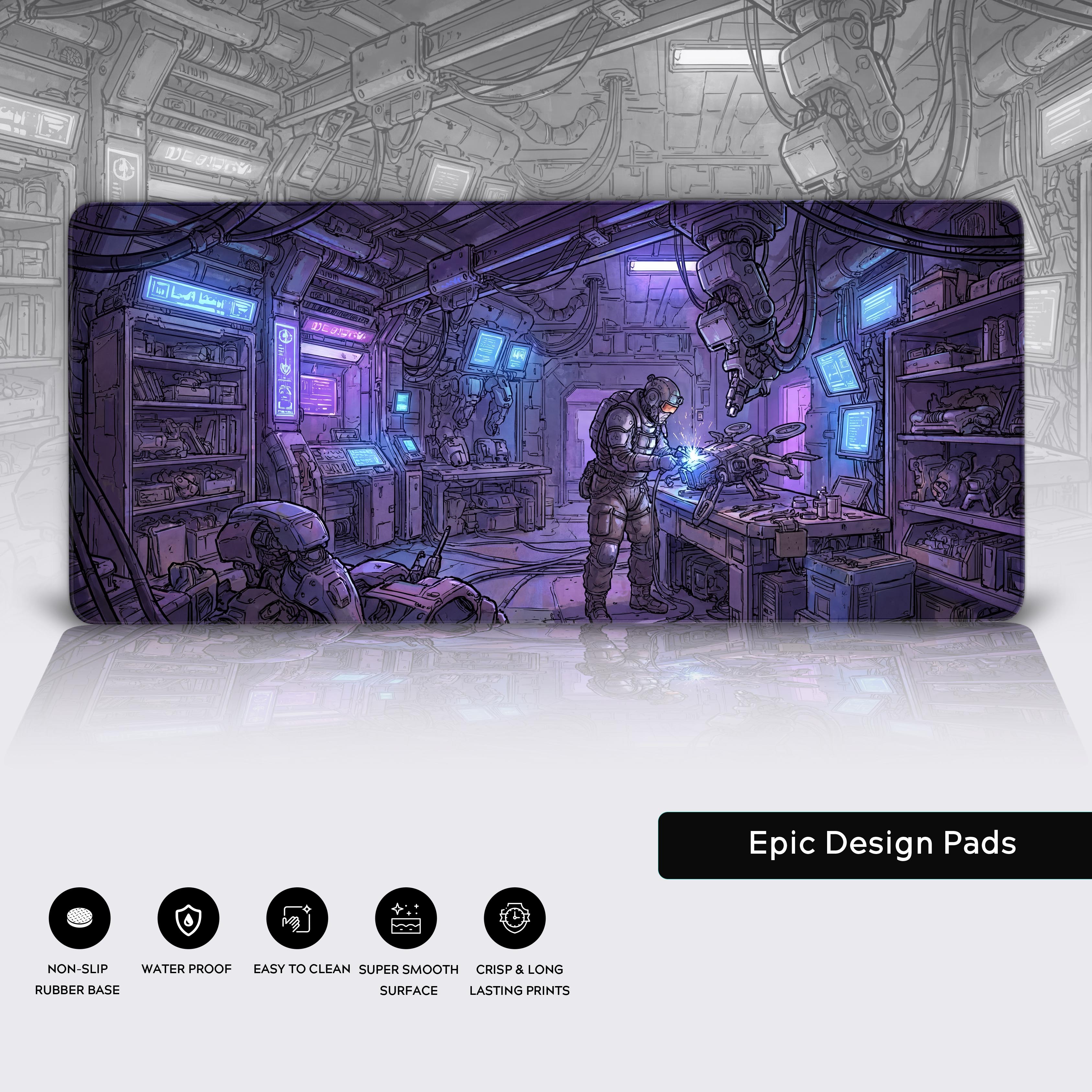 In the quiet hum of the Neon Workshop, surrounded by glowing monitors and tangled wires, a lone creator grinds away. This desk mat captures that moment of intense focus, transforming your desk into a retro-futuristic lab where progress is forged in solitude.