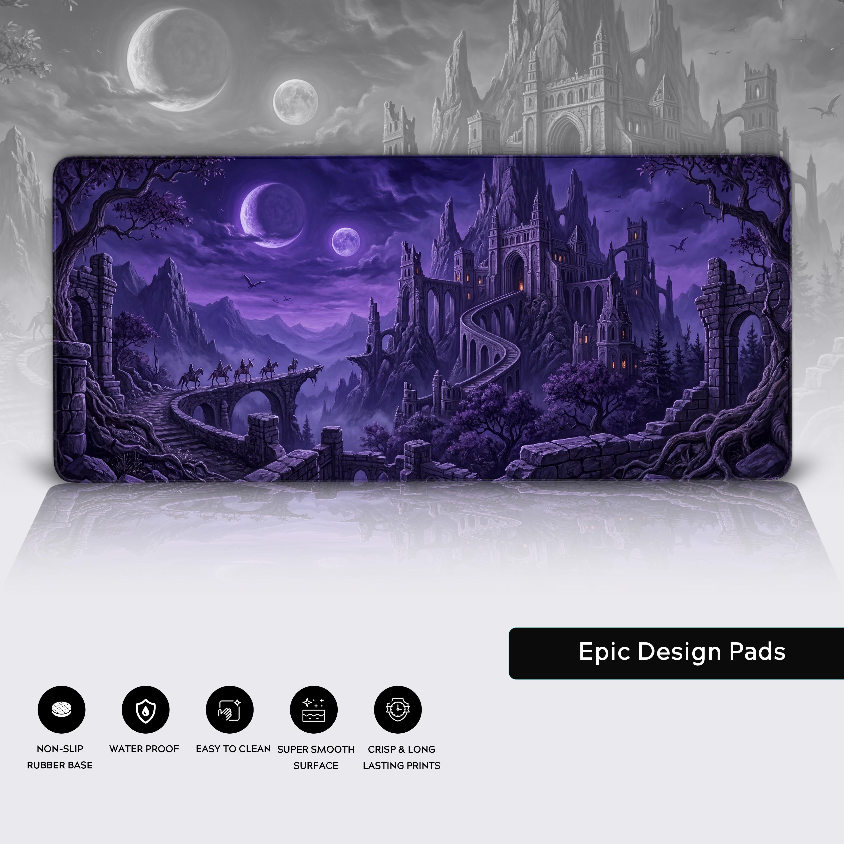 Transform your desk into a realm of high-fantasy with the Nocturnal Citadel desk mat. Bathed in the ethereal glow of twin moons, this design captures an imposing gothic fortress carved into jagged peaks, where a silent vanguard embarks on a fateful quest.