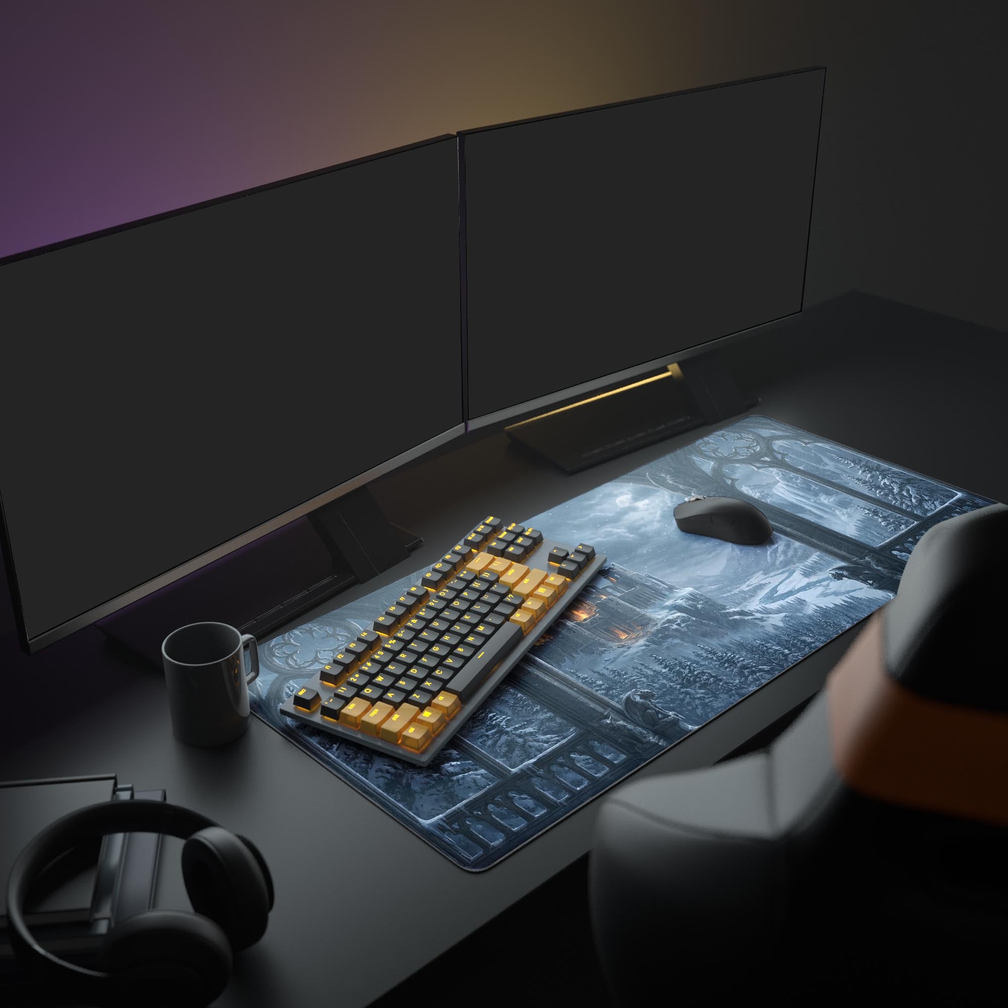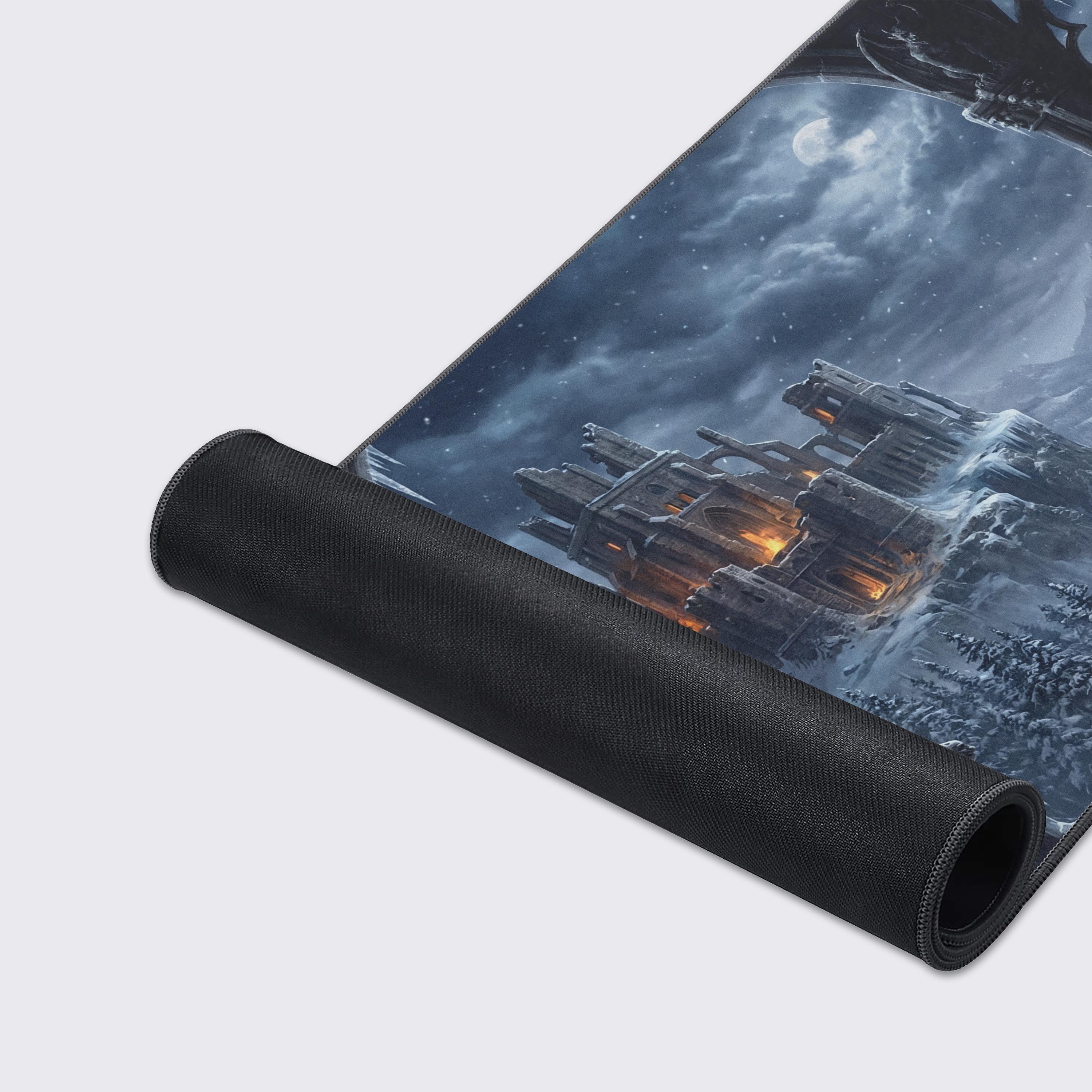 In a world of noise, claim your sanctuary. The Obsidian Fortress desk mat transforms your desk into a bastion of concentration, framed by gothic archways overlooking a formidable, snow-covered citadel. It’s a powerful reminder to keep your own fires burning, even when the world outside is freezing.