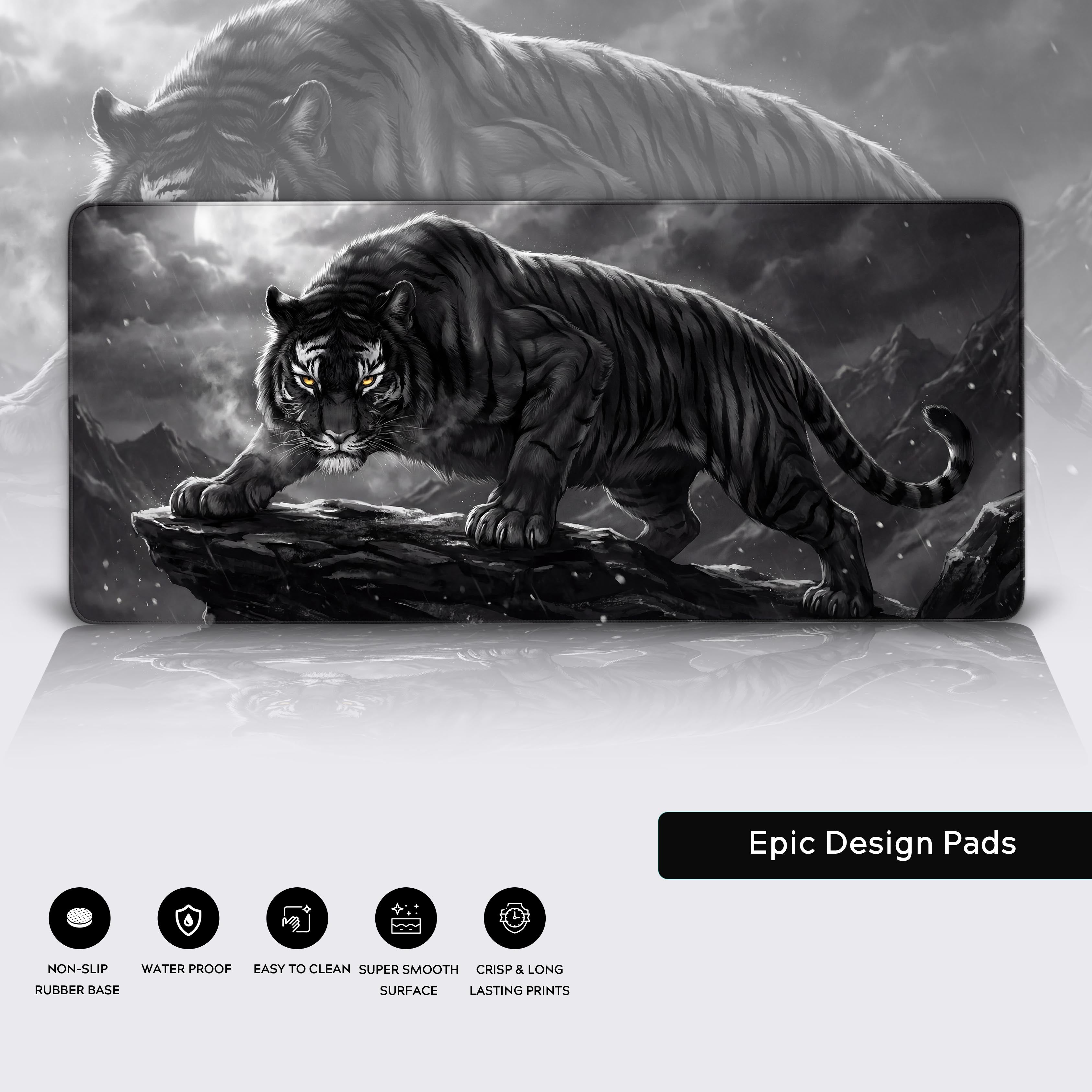 This isn't just a desk mat; it's a statement. The Onyx Predator design embodies the spirit of the solitary hunter, focused and unflinching. The striking monochrome tiger, poised against a stormy backdrop, mirrors your own intensity. Its gaze is fixed, its purpose clear—a powerful symbol for anyone who owns their grind.