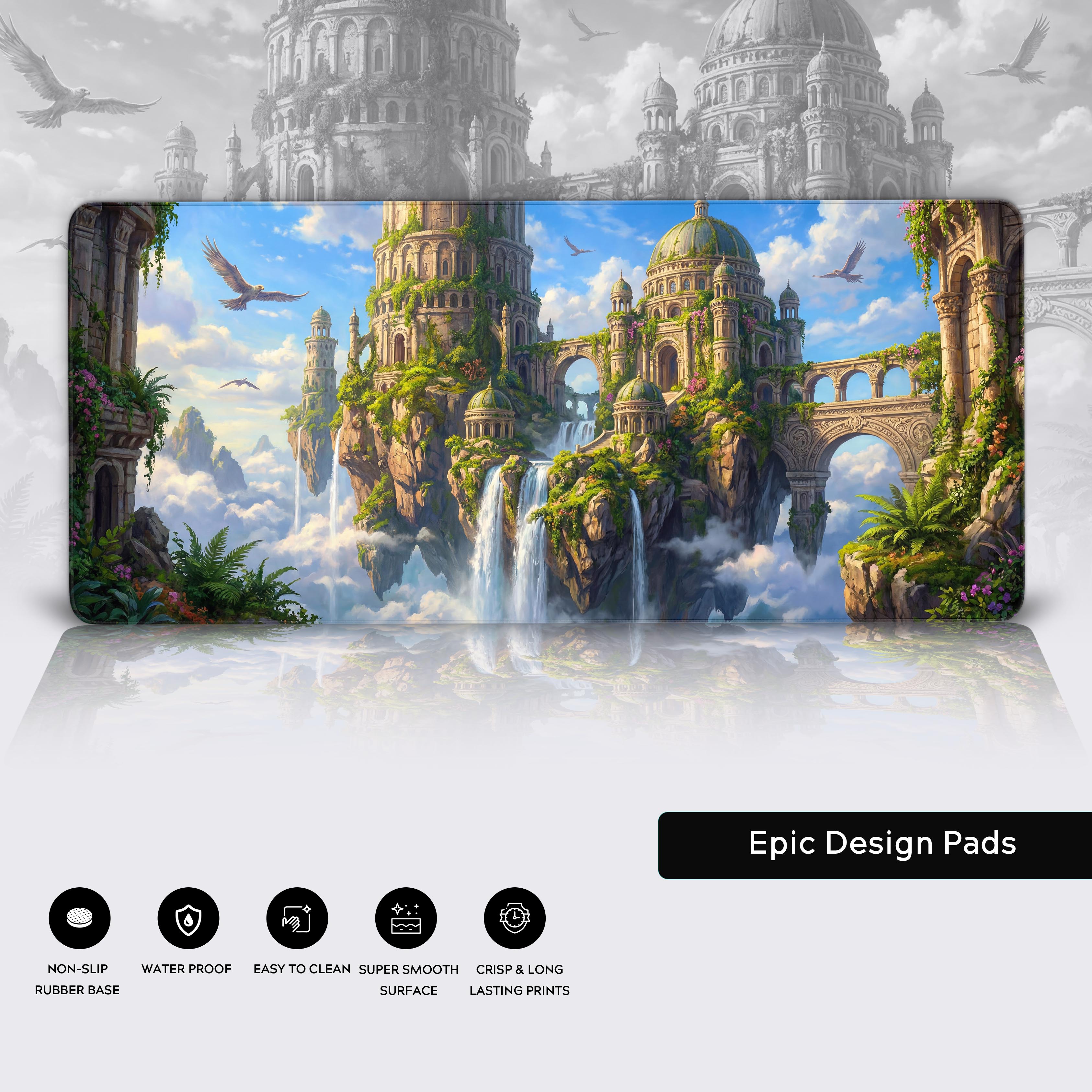 Let your workspace ascend to the clouds with the Overgrown Aether Ruins desk mat. This isn't just a surface; it's a window into a forgotten citadel, now reclaimed by nature's gentle hand. Gaze upon majestic floating islands draped in lush flora, where ancient architecture and perpetual waterfalls coexist in perfect harmony.