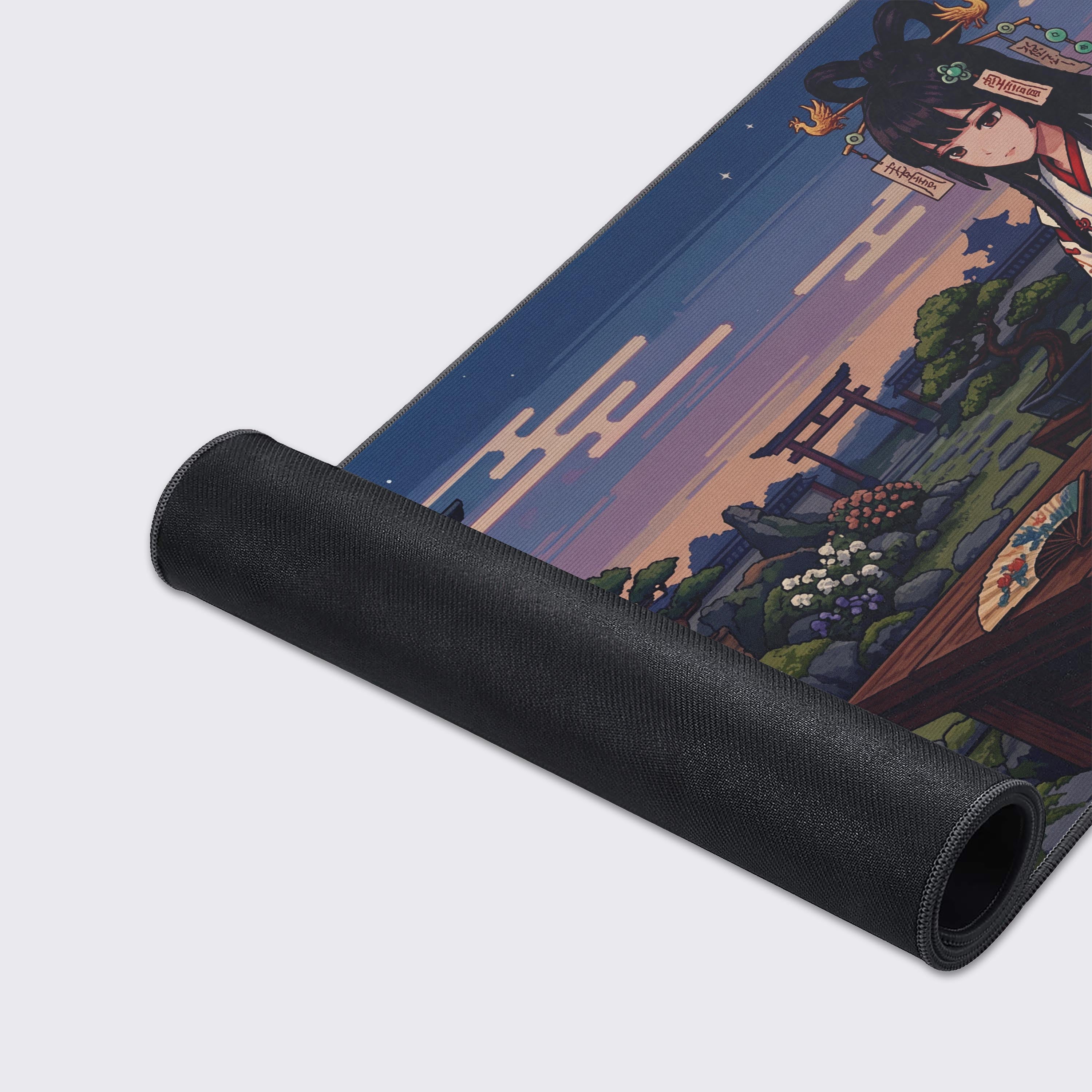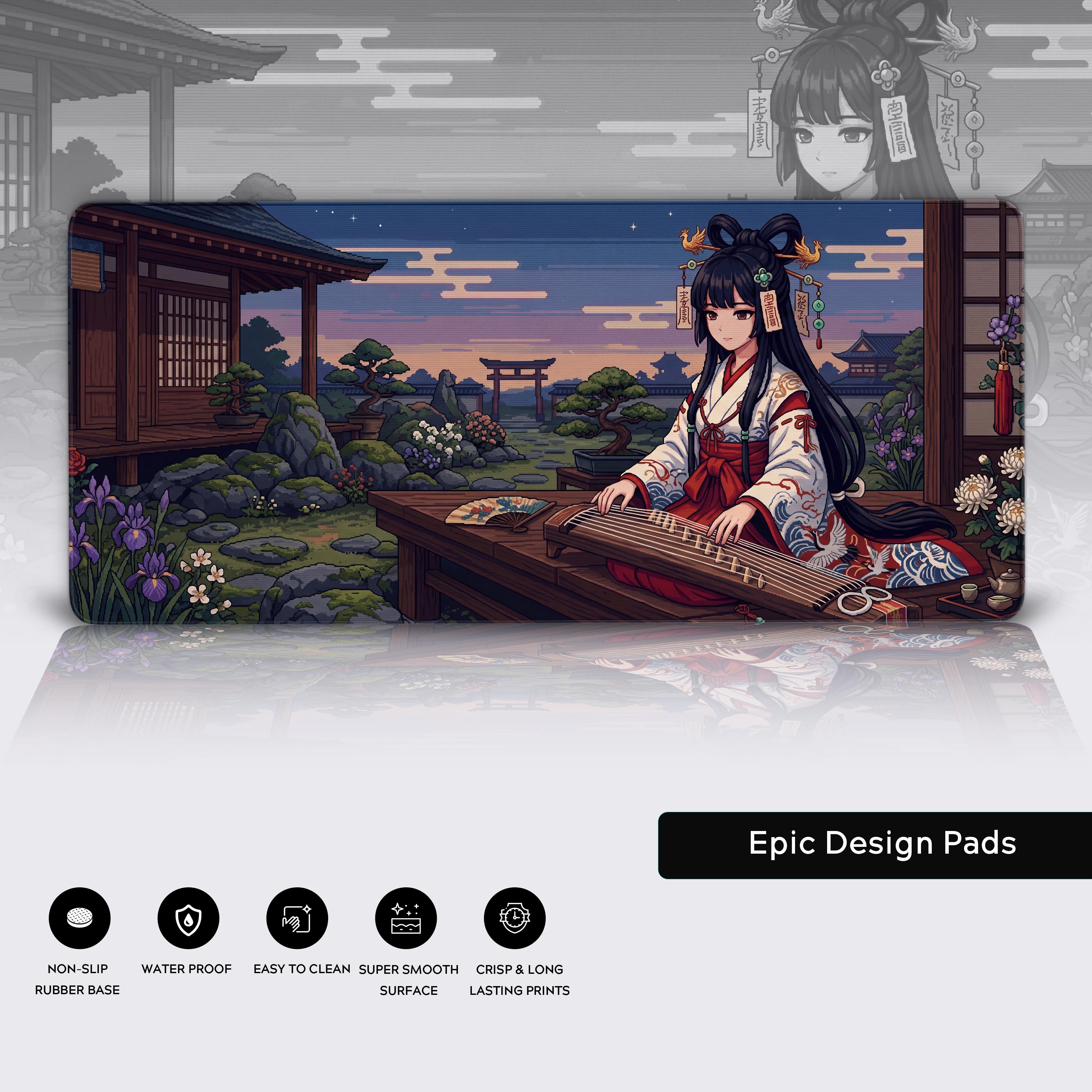 Escape the chaos of looming deadlines and constant notifications. The Pixel Harmony desk mat transforms your workspace into an enclave of calm precision, featuring a serene retro-style courtyard at twilight. Let the composed musician and the ancient elegance of her instrument inspire your own mastery and focus.