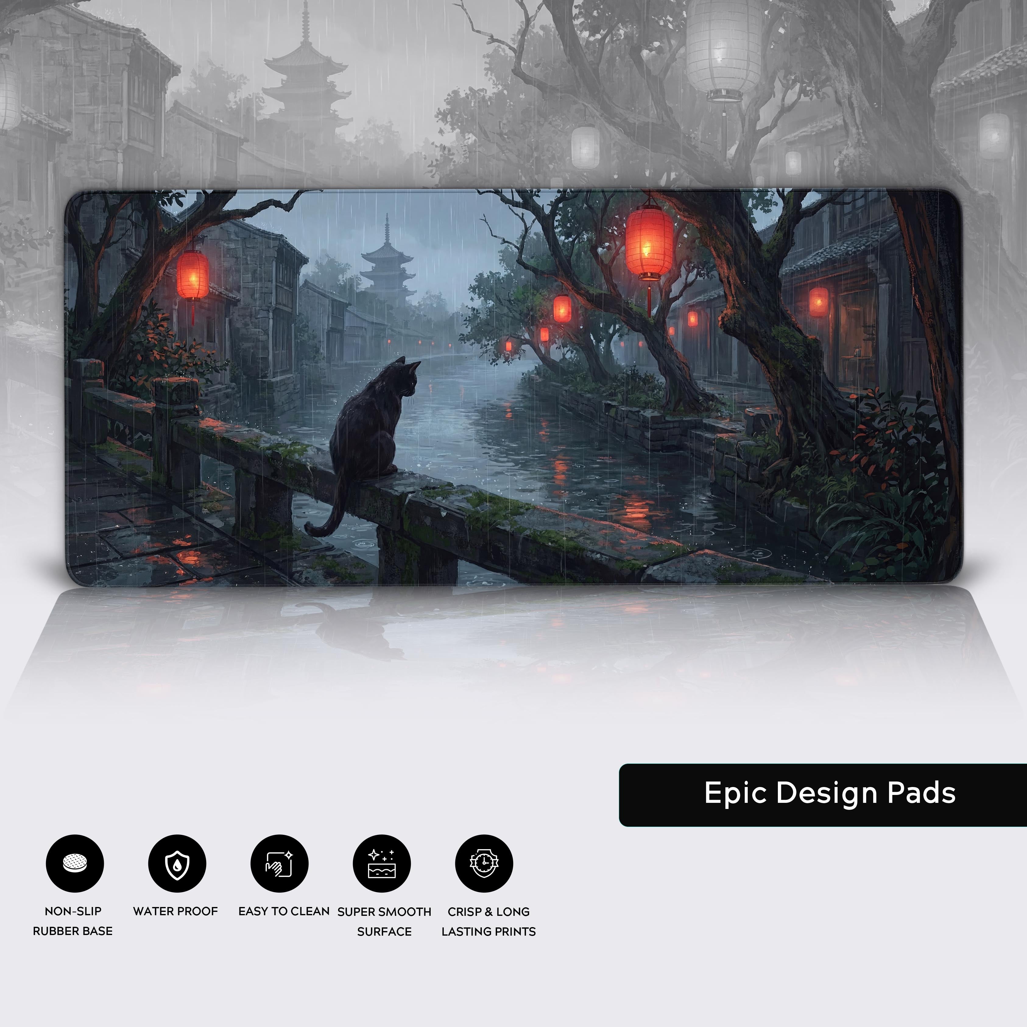Transform your desk into a sanctuary of calm with the Rainy Watcher desk mat. This captivating artwork features a solitary black cat on an ancient bridge, unfazed by the storm. Glowing red lanterns cut through the gloom, reflecting on the rain-slicked canal and reminding you to find clarity in the chaos.