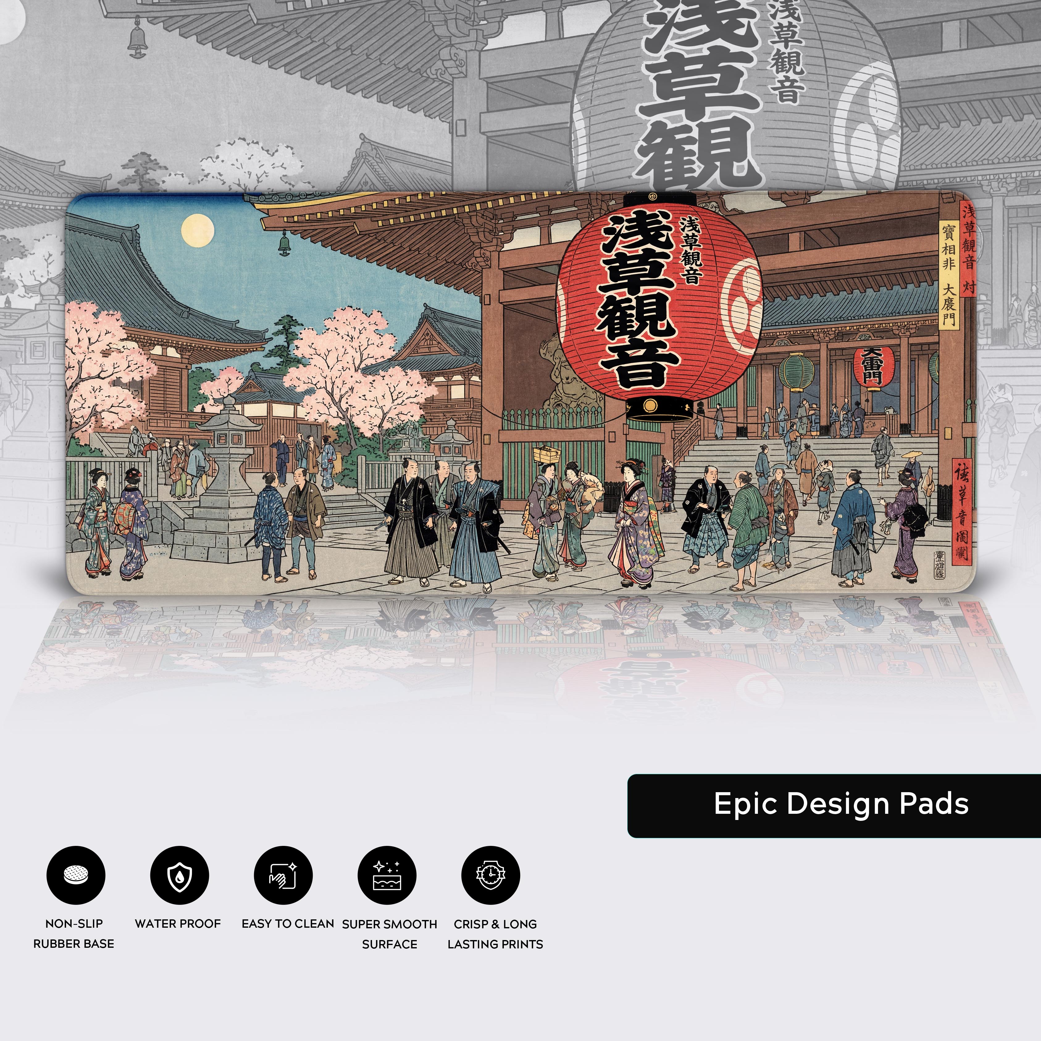 Bring the vibrant energy of the Edo period to your desk with the Red Lantern desk mat. This stunning Ukiyo-e artwork captures the bustling Asakusa Kannon Temple, dominated by its massive, iconic red lantern—a symbol of protection and enlightenment. It's a window into a world of samurai, merchants, and pilgrims, all framed by the fleeting beauty of cherry blossoms.