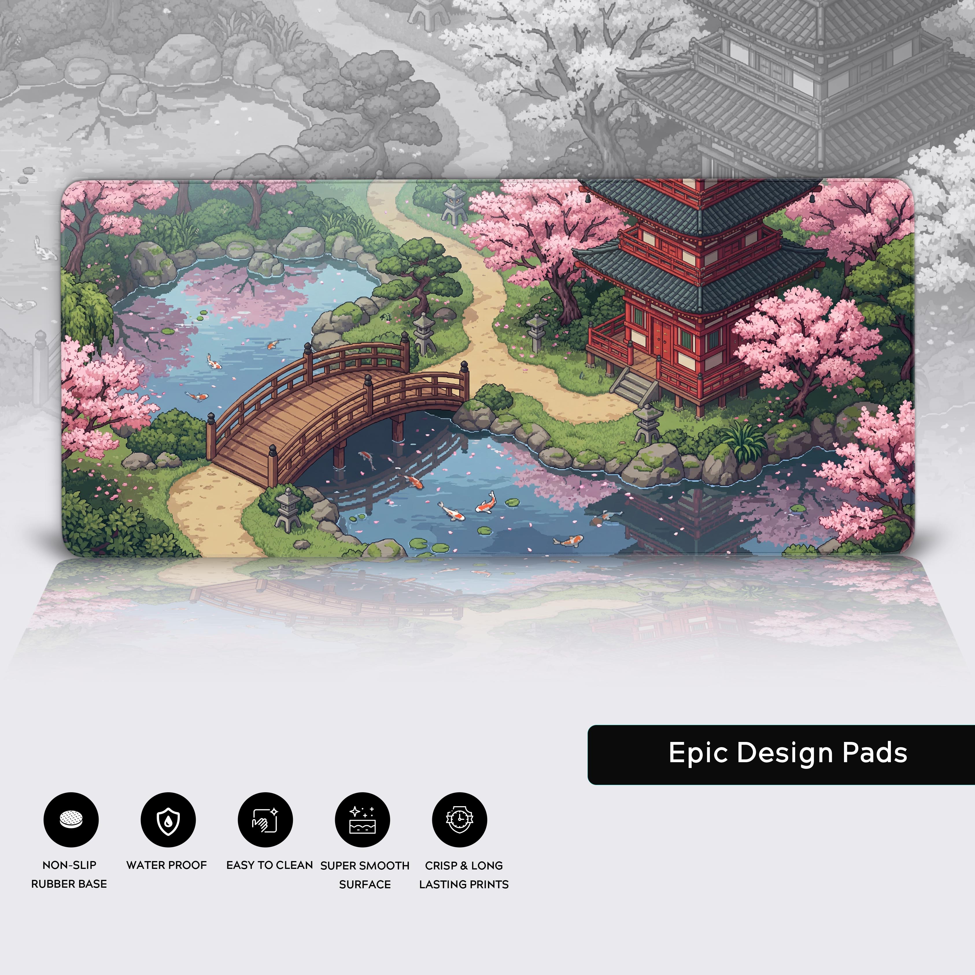 Transform your desk from a place of work into a tranquil retreat with the Retro Sakura Path desk mat. This pixel art landscape offers a comforting escape to a traditional Japanese garden, complete with blooming sakura, a serene koi pond, and a timeless pagoda, all rendered in a charming, nostalgic style.