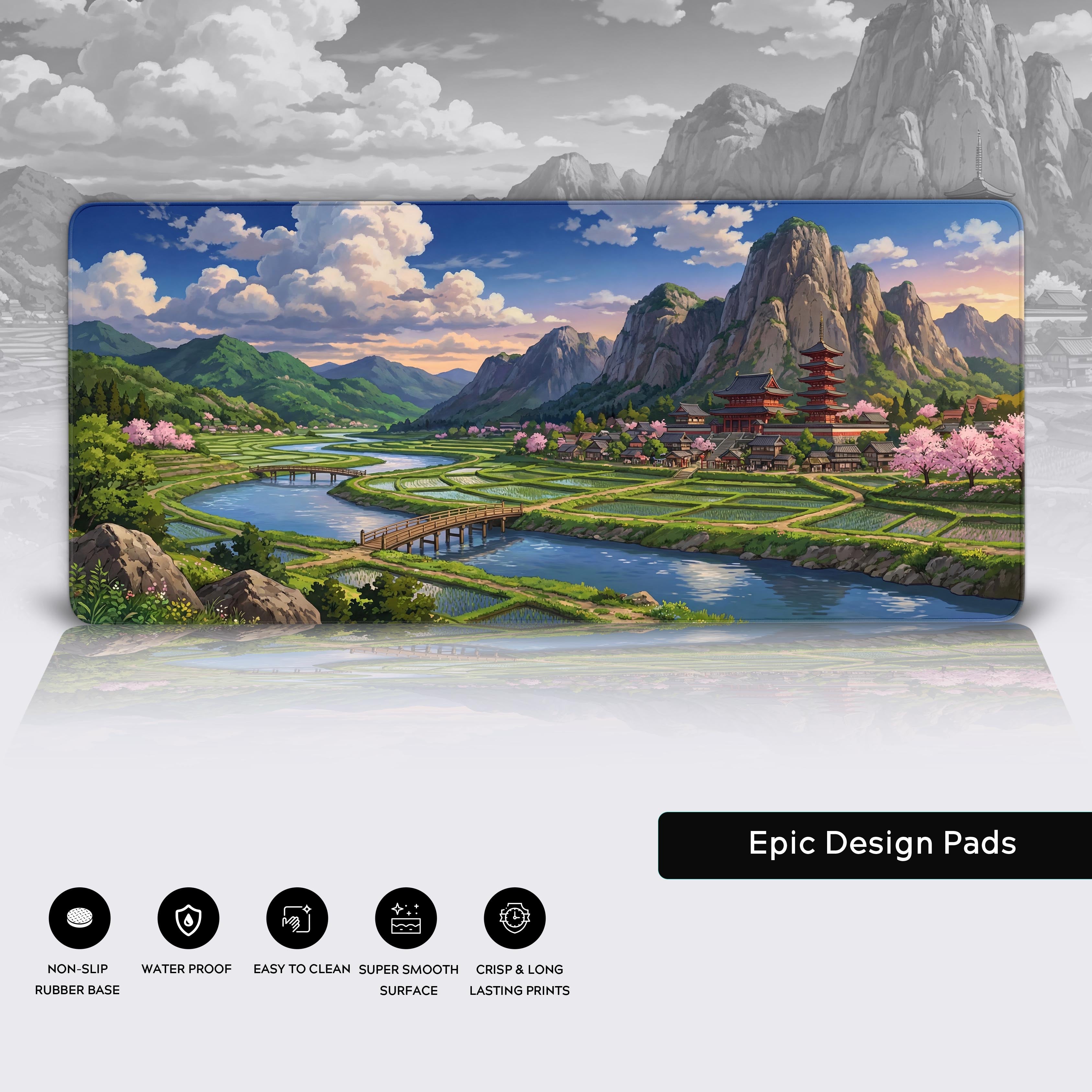 Transform your workspace into a sanctuary of peace with the Sacred Valley Echo desk mat. This stunning design invites you to a world where nature and ancient wisdom coexist in perfect harmony. Let your eyes wander across serene rice paddies, blooming sakura, and timeless pagodas nestled against majestic mountains.