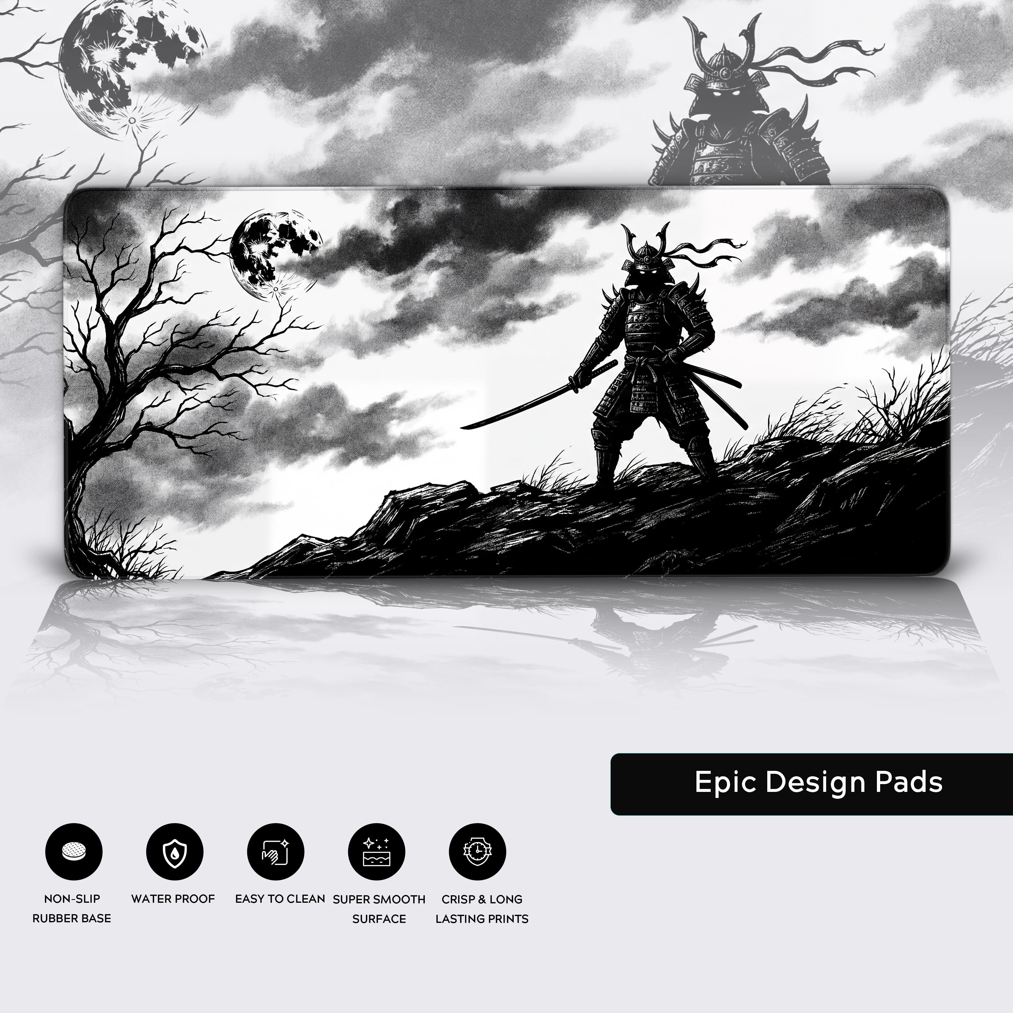 Silence the noise. Hone your focus. Let the Shadow Samurai guide your every move. Add this masterpiece to your setup and conquer your day.