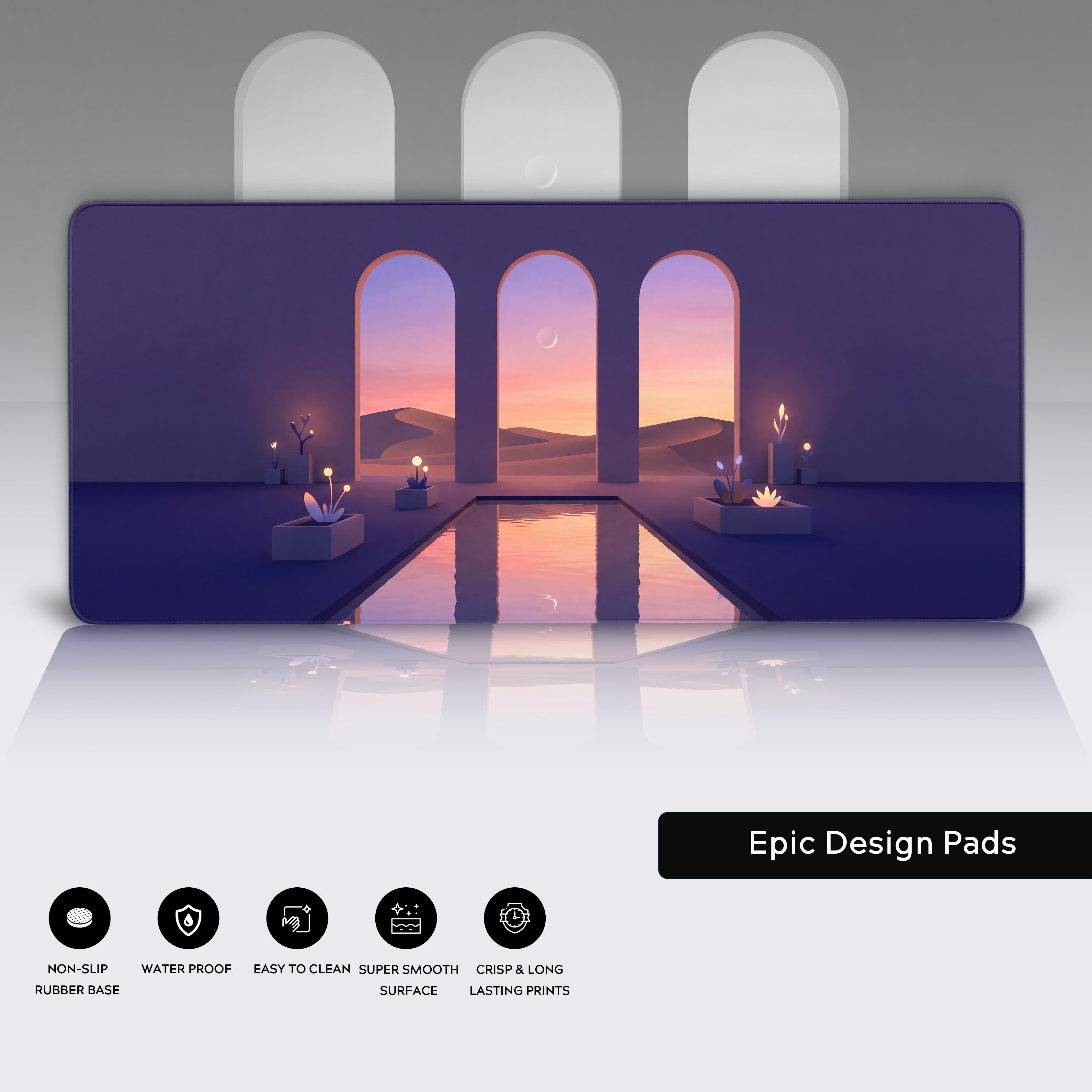 Gaze upon a surreal desert at twilight, bathed in calming violet and warm orange hues. The central reflecting pool symbolizes clarity, while glowing flora serves as a quiet reminder of inspiration's power. It’s the perfect visual anchor to help you disconnect from chaos and enter a state of deep work.