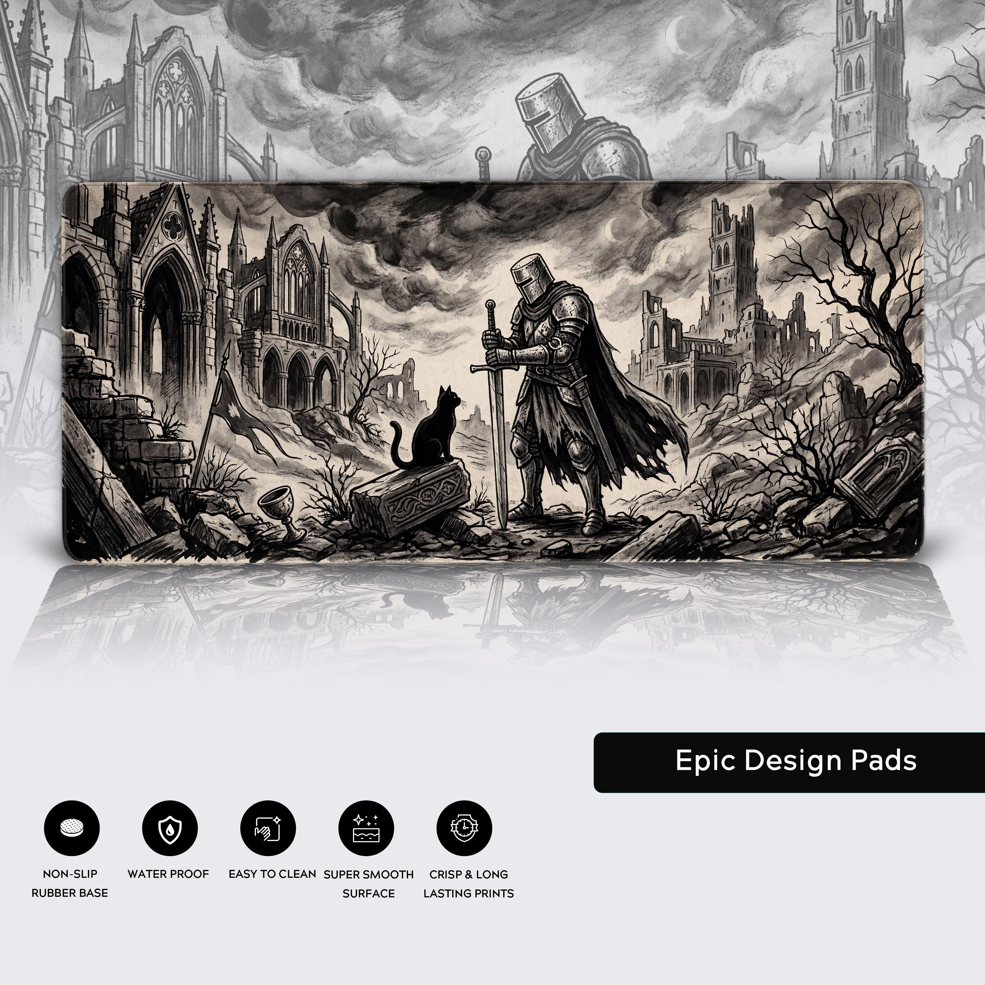 In a world of constant digital noise, the Silent Companion desk mat offers a portal to a forgotten age. Let your focus sharpen alongside the stoic guardian, a knight who finds strength not just in his sword, but in the quiet presence of his feline friend. This meticulously rendered monochromatic scene, set against crumbling gothic ruins, is a powerful meditation on resilience and endurance.