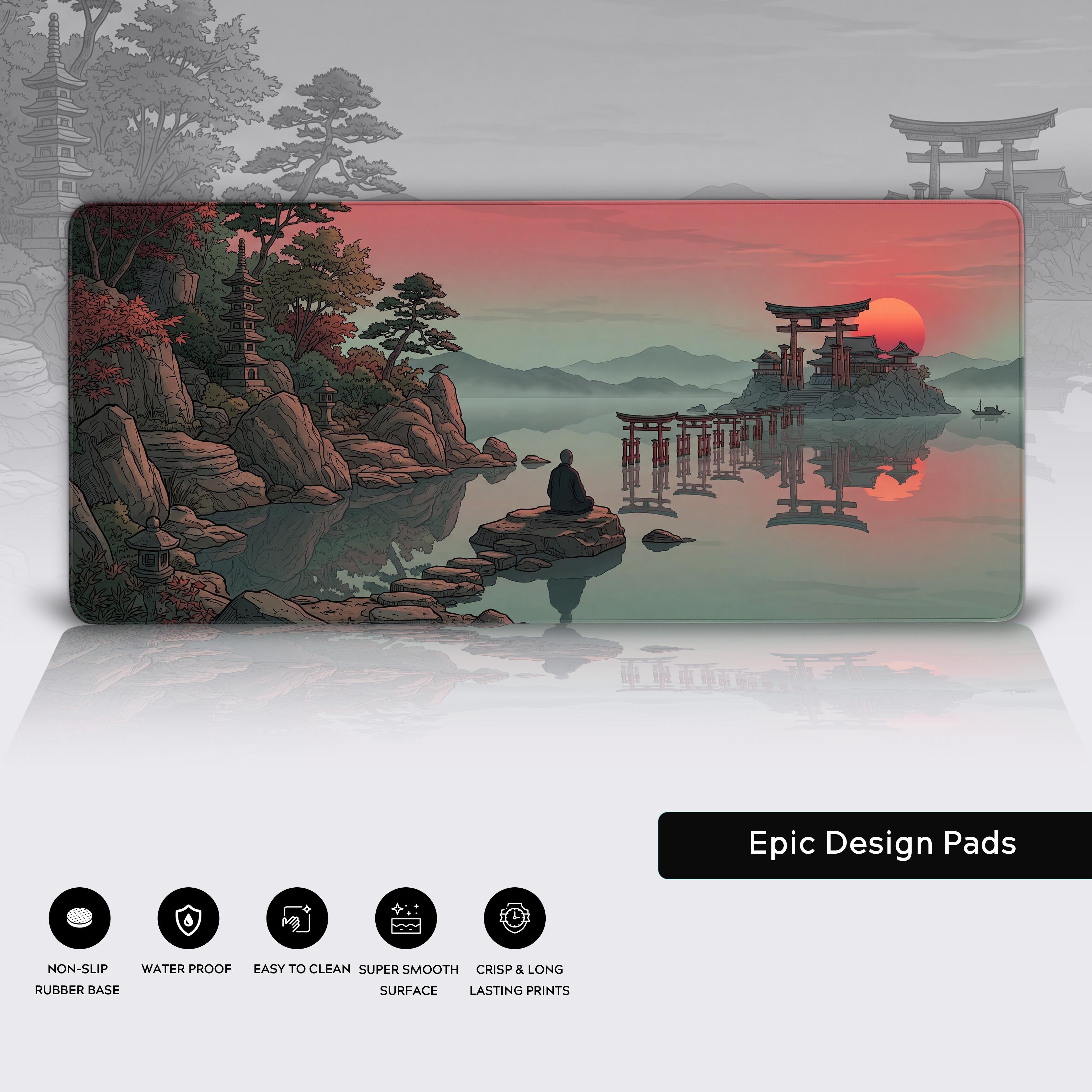 In the chaos of deadlines and intense gaming sessions, your desk should be a sanctuary, not another source of stress. The Silent Focus desk mat transforms your workspace with its serene Japanese landscape. Featuring a meditating monk, iconic Torii gates, and a tranquil sunrise, this design is your visual anchor to calm and concentration.