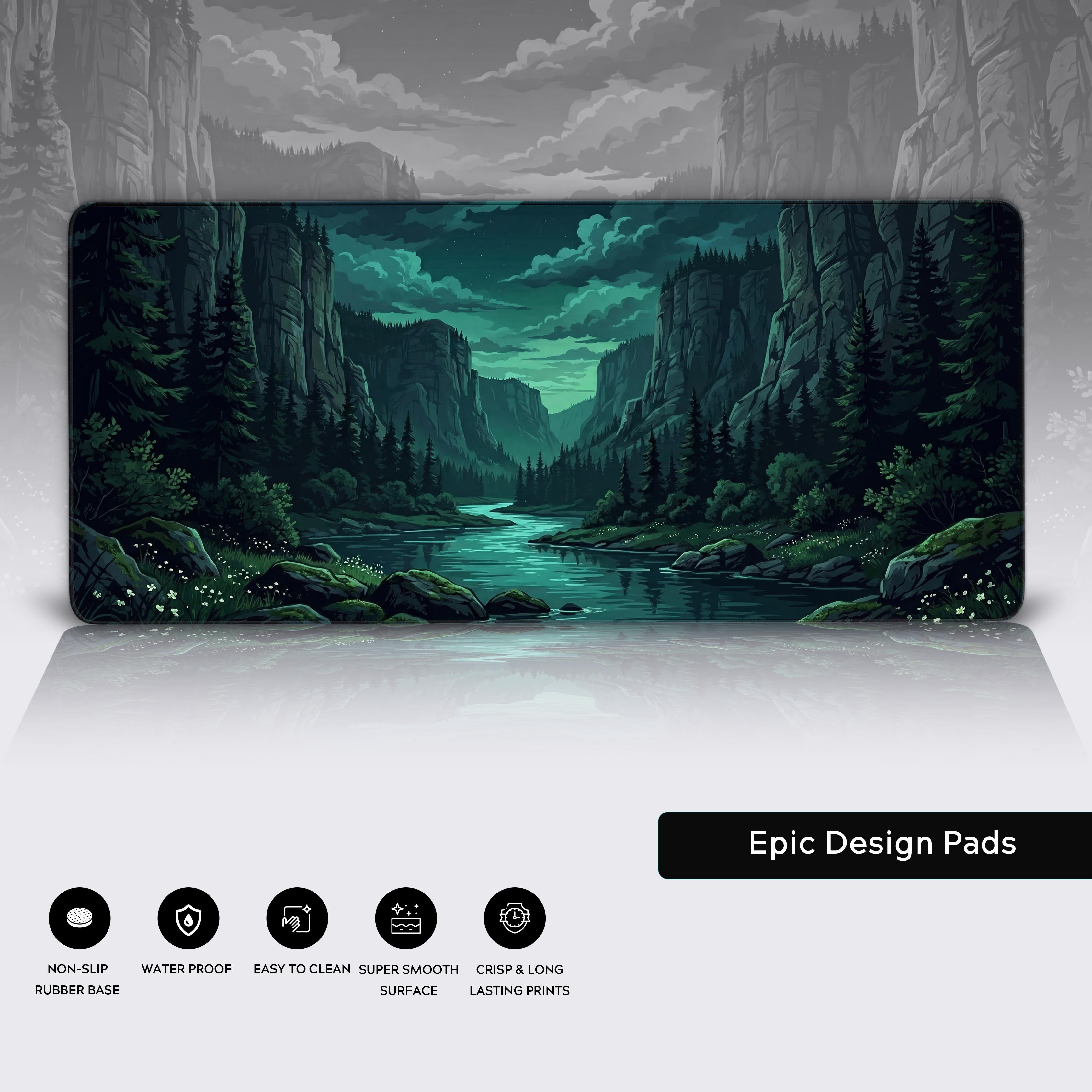 Escape the daily chaos and enter a world of profound peace with the Silent Gorge desk mat. This design captures the majestic stillness of an untouched canyon at midnight, where ancient cliffs guard a silent, flowing river. The cool, emerald hues create an atmosphere of tranquility, helping to absorb distractions and deepen your concentration.