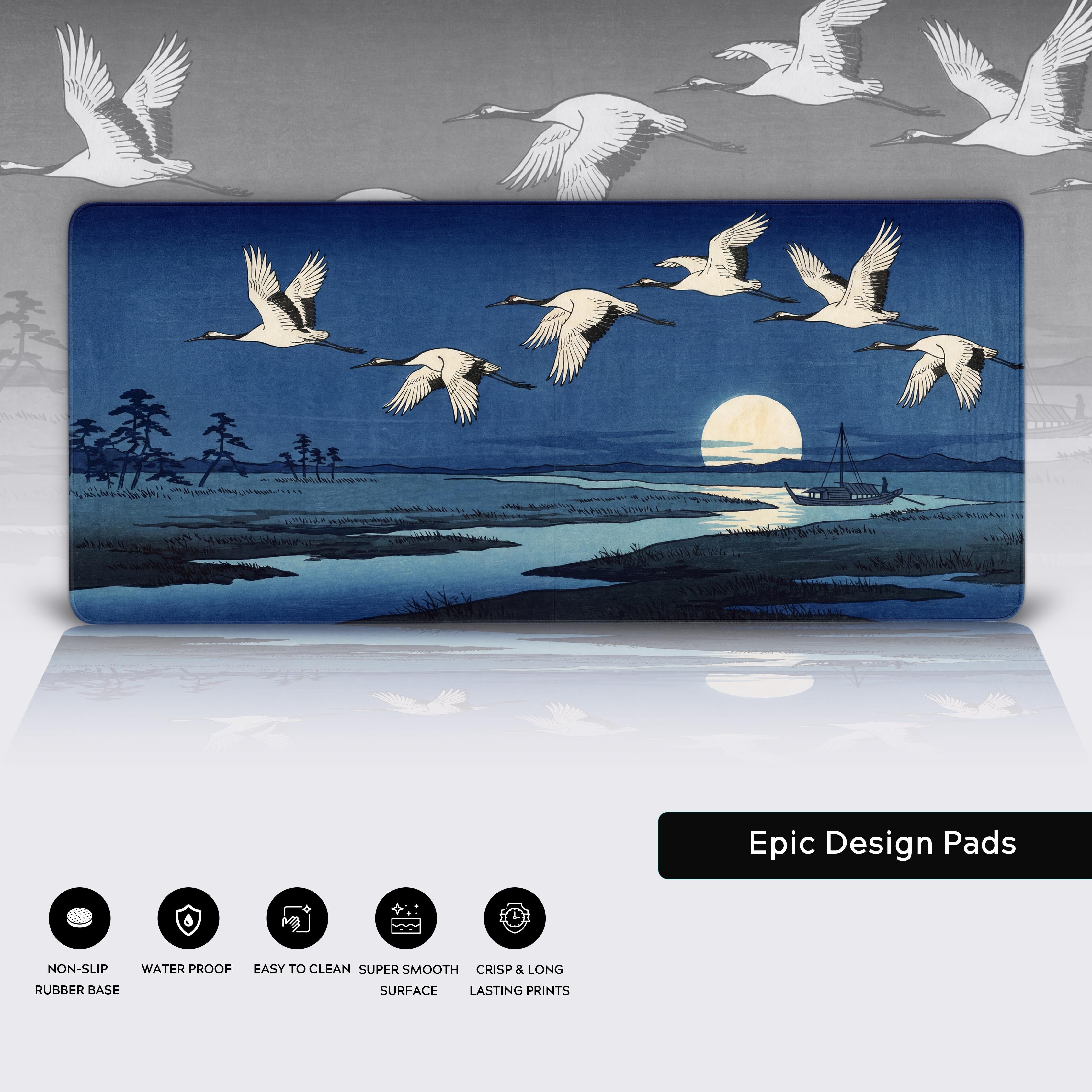 Transform your desk into a scene of serene contemplation with the Silent Migration desk mat. Inspired by the timeless Japanese Ukiyo-e art style, this design captures the graceful flight of cranes—symbols of longevity and good fortune—against a deep indigo night sky. Let the quiet elegance of this piece guide your focus and creativity.