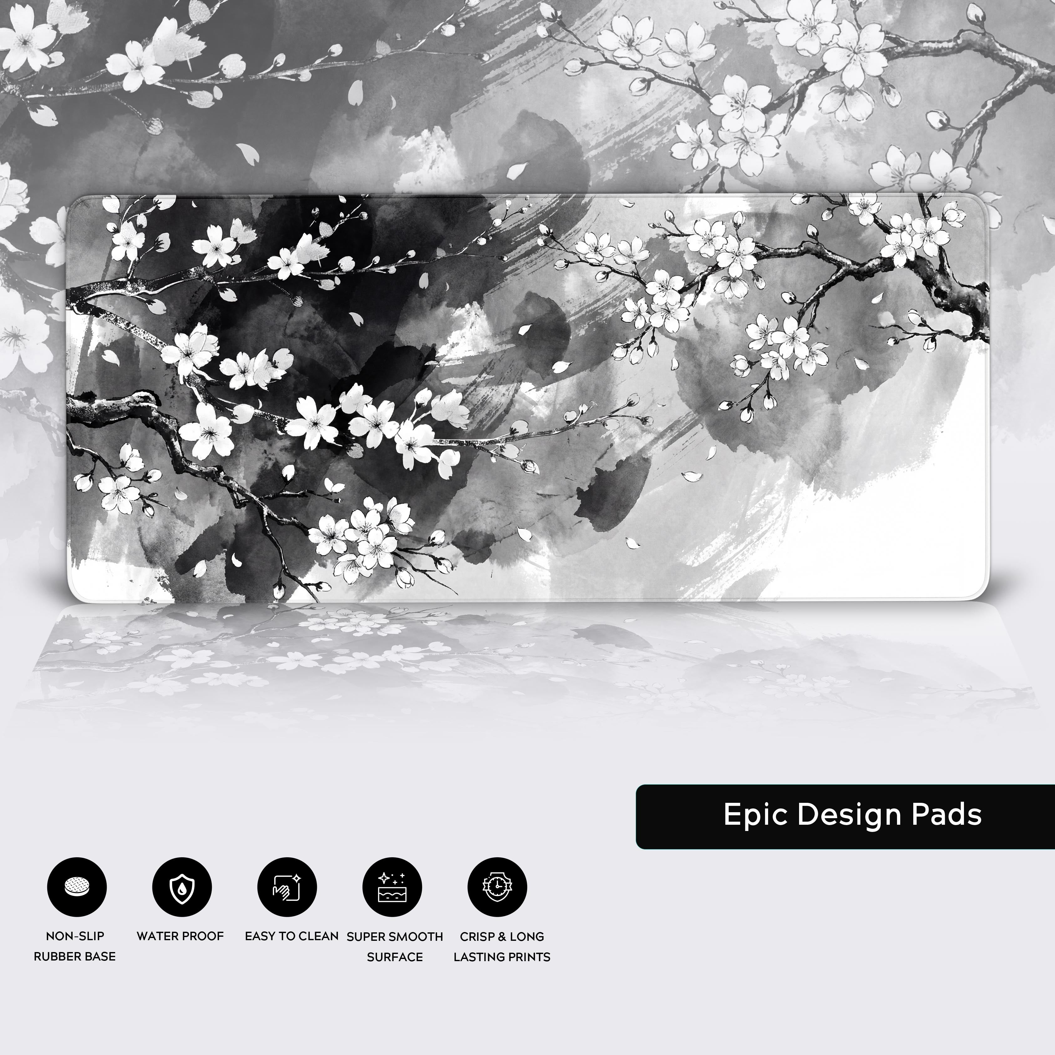 Transform your desk into a sanctuary of calm with the Silent Sakura desk mat. Inspired by the traditional Japanese art of Sumi-e, this design captures the poignant beauty of cherry blossoms, reminding us of the elegance in simplicity. The stark monochrome palette strips away distraction, creating a space for Zen-like clarity and concentration.