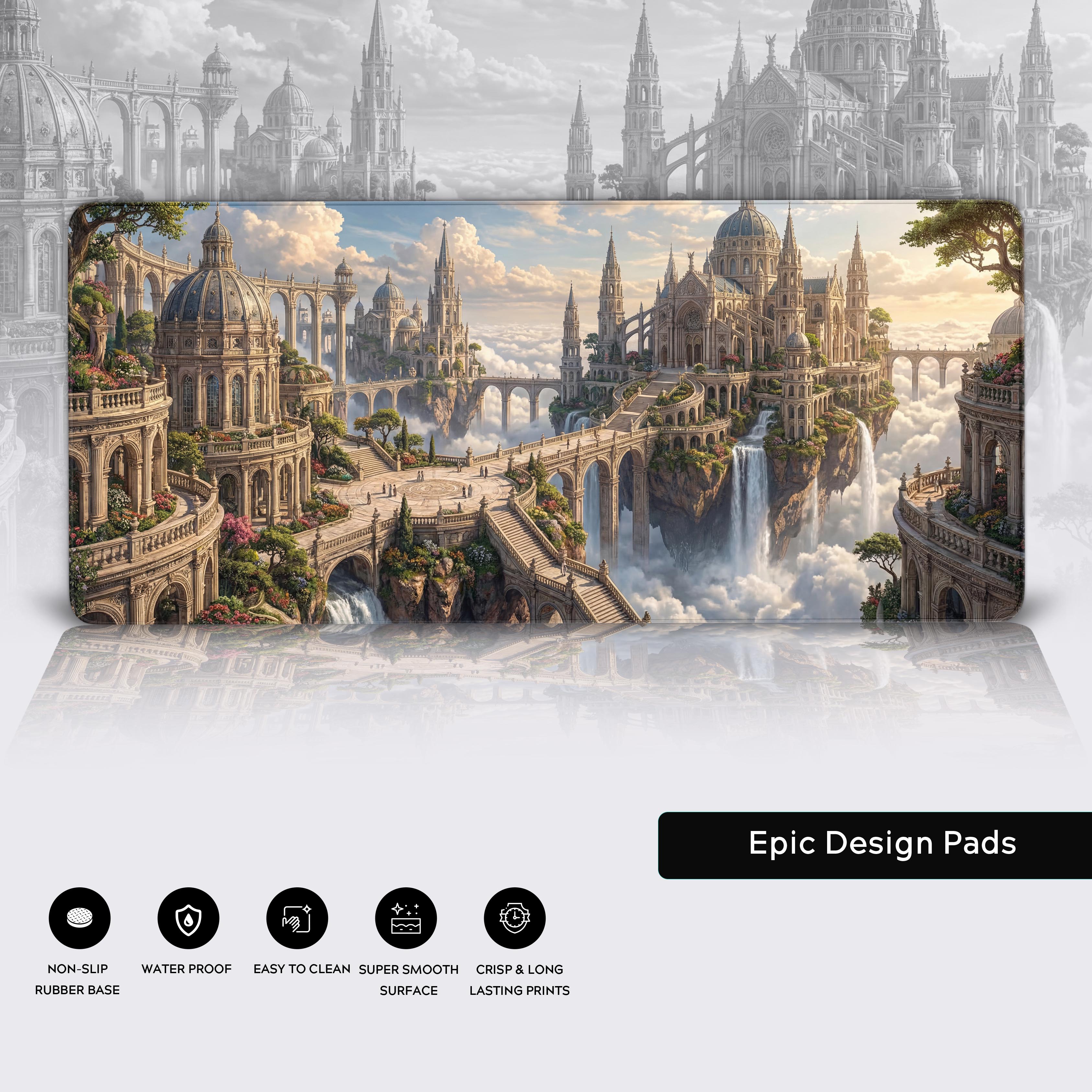Transform your desk into a realm of limitless perspective with the Sovereign Sky City desk mat. This design captures a breathtaking city cradled by the heavens, where grand cathedrals and winding viaducts float amongst the clouds. It’s a tribute to the impulse to reach for the infinite, inspiring a mindset of grand ambition.