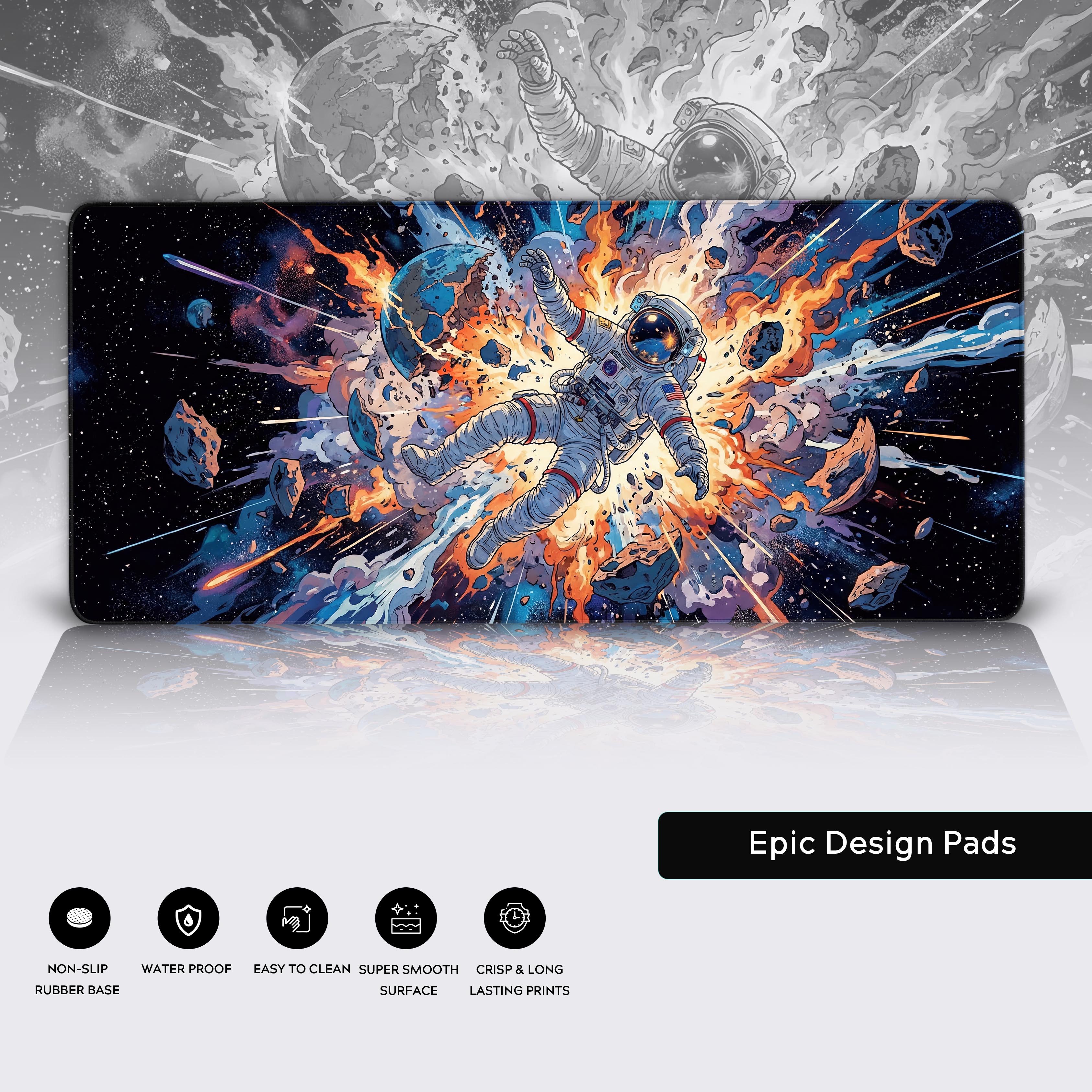 Transform your desk into a window overlooking the edge of existence. The Space Explosion desk mat captures the stunning, silent moment of planetary destruction, featuring a lone astronaut adrift in the beautiful chaos. The vibrant oranges of the explosion stand in stark contrast to the cold, deep blue of the void, creating a visually arresting masterpiece for your workspace.
