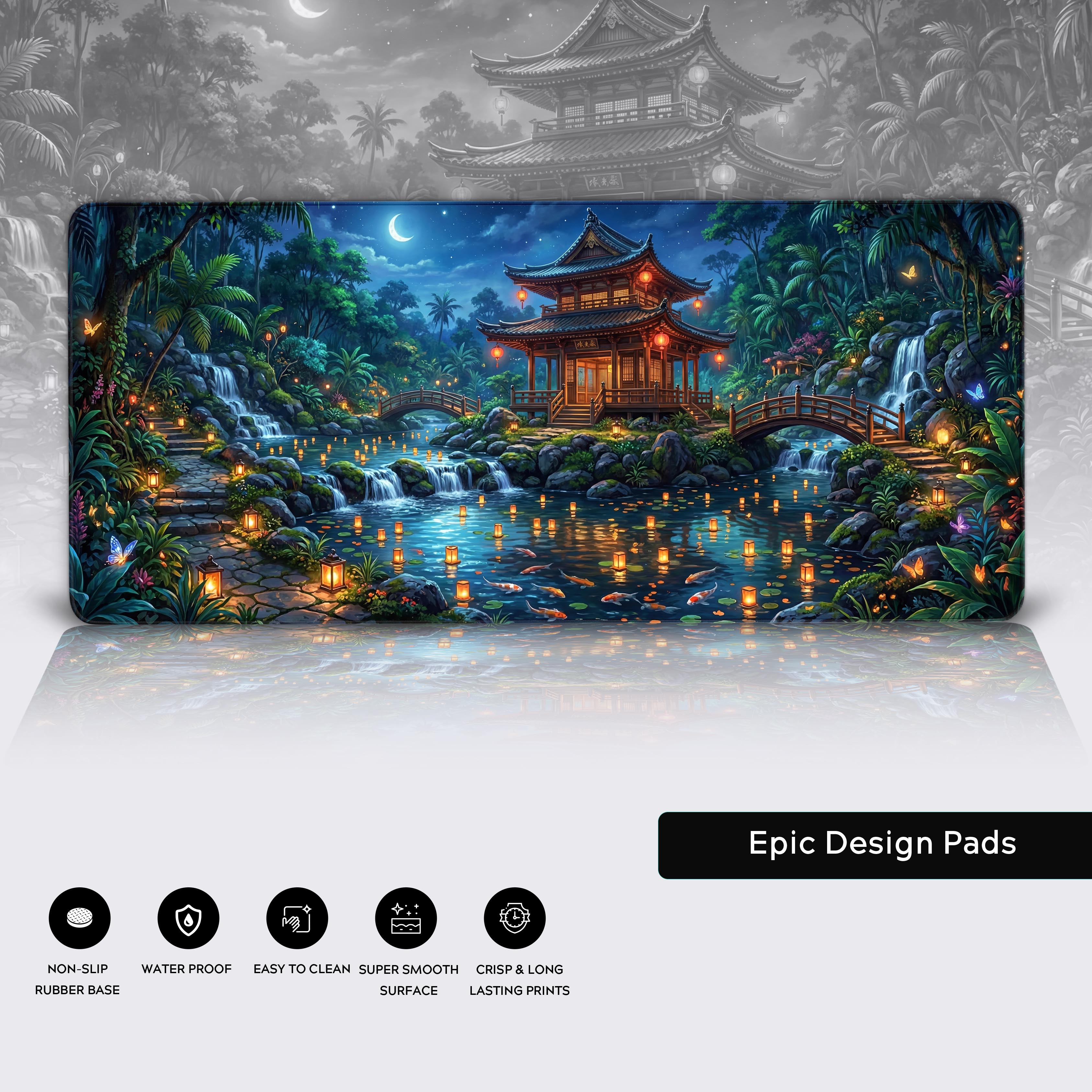 Step into the Spirit Garden, a secret world where a moonlit pavilion casts a warm glow over a tranquil lake. This desk mat captures a magical festival of lights, with countless lanterns reflecting on the azure water, creating a perfect balance between the cool night and inviting warmth.
