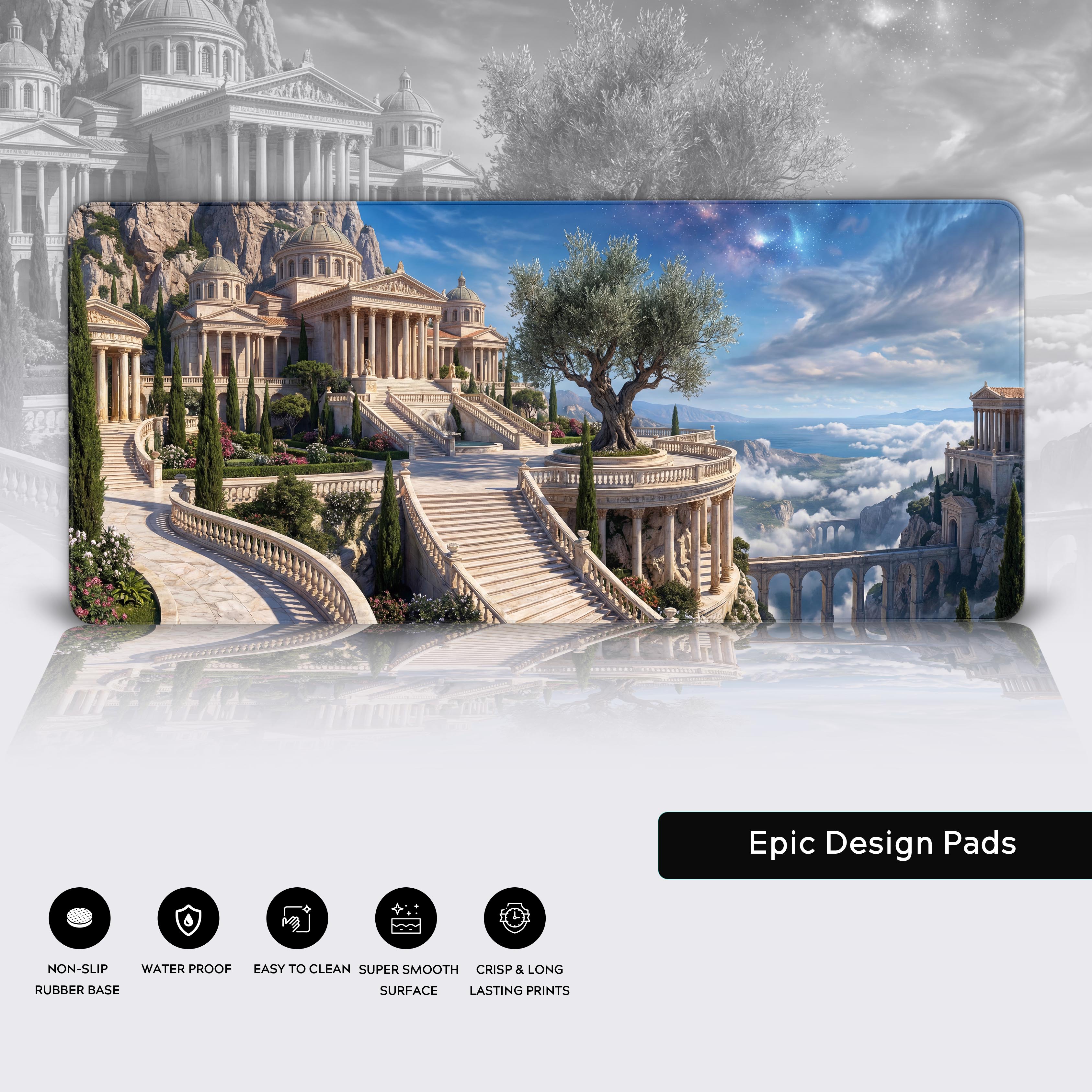 Where does earthly history end and the cosmos begin? The Starlight Marble Temple desk mat places your setup at this sacred intersection. Featuring an ancient olive tree at the heart of a sprawling marble sanctuary, this design is a meditation on legacy and the future. The grand staircases lead to a view above the clouds, where a celestial nebula bleeds into the sky.