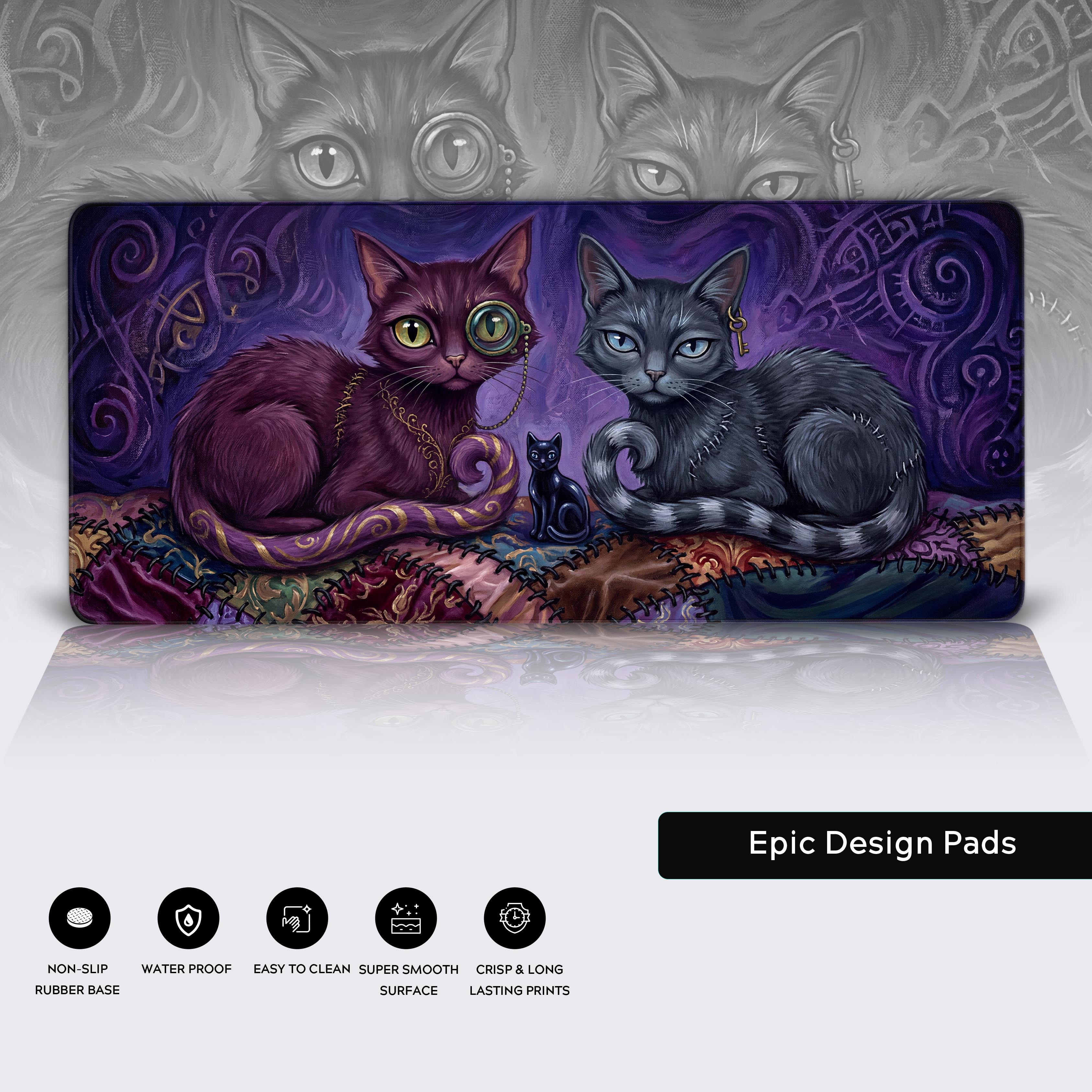 Step away from the ordinary and into a world of dark, whimsical magic with the Stitched Shadows desk mat. This captivating design features two arcane feline familiars, one with a mystic monocle and the other with gothic stitches, resting on a patchwork of forgotten fabrics. It's the perfect centerpiece for the unconventional mind that thrives in the beautifully bizarre.