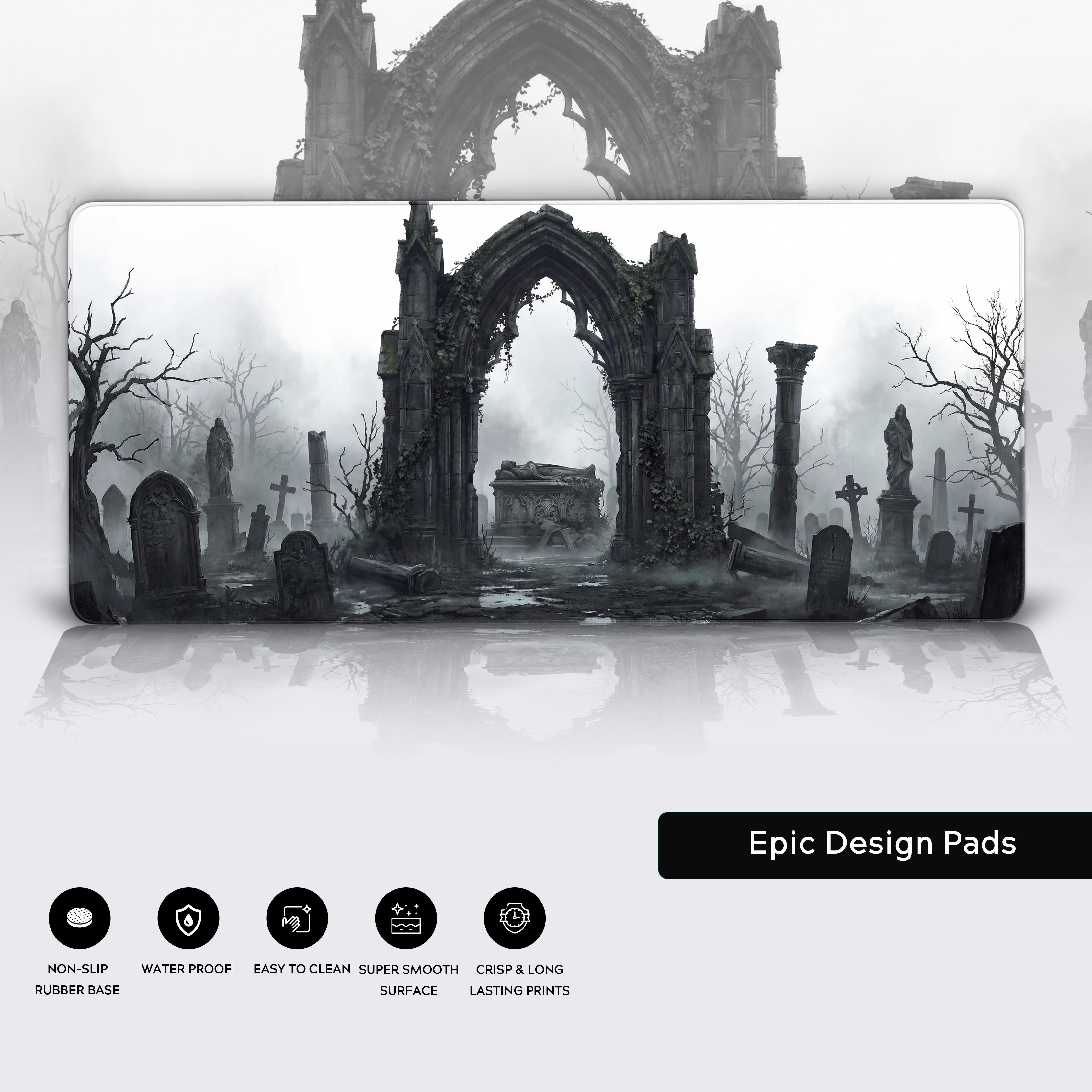 Transform your workspace into a sanctuary of quiet contemplation with the Stone Memory desk mat. This stunning monochromatic landscape captures a forgotten graveyard, where crumbling gothic ruins and ancient tombs rest in a perpetual, silent mist, creating an atmosphere of profound peace.
