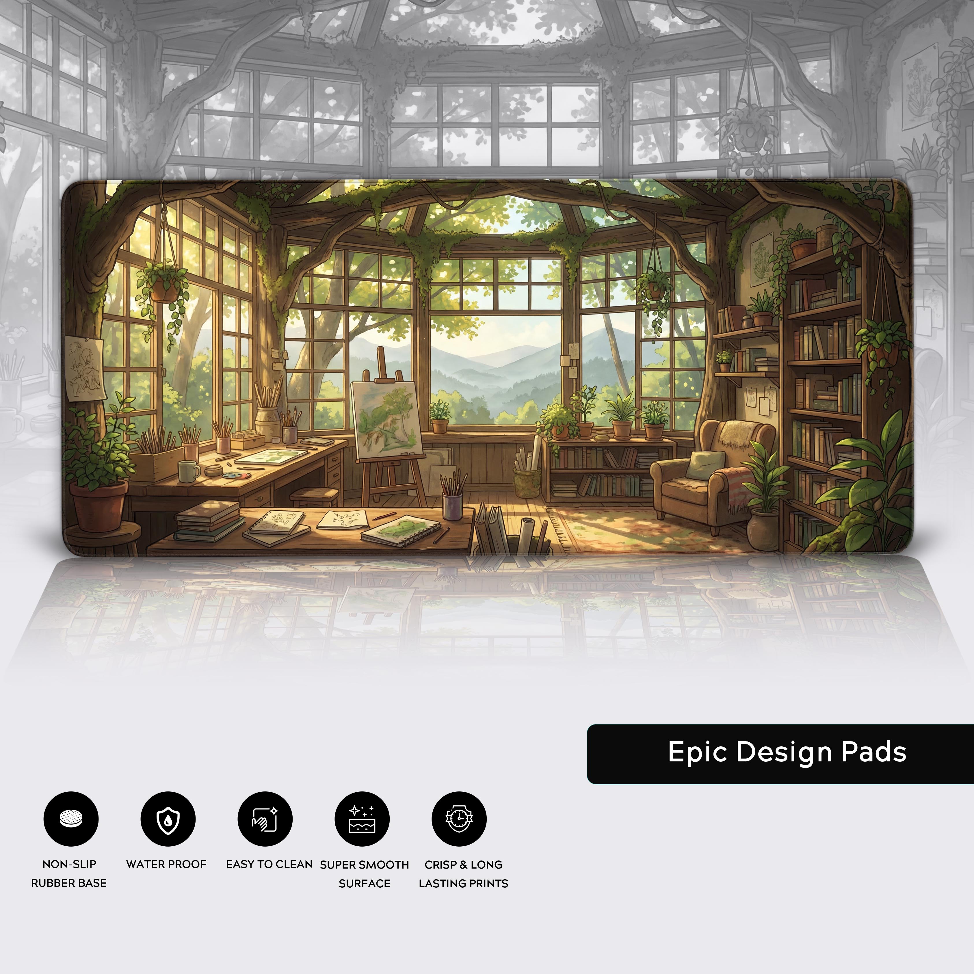 Escape the noise and enter the Sunlit Atelier, a creative haven where inspiration flows as freely as the golden light through the windows. This desk mat captures that perfect moment of quiet focus, transforming your workspace into a treetop studio with a breathtaking view.