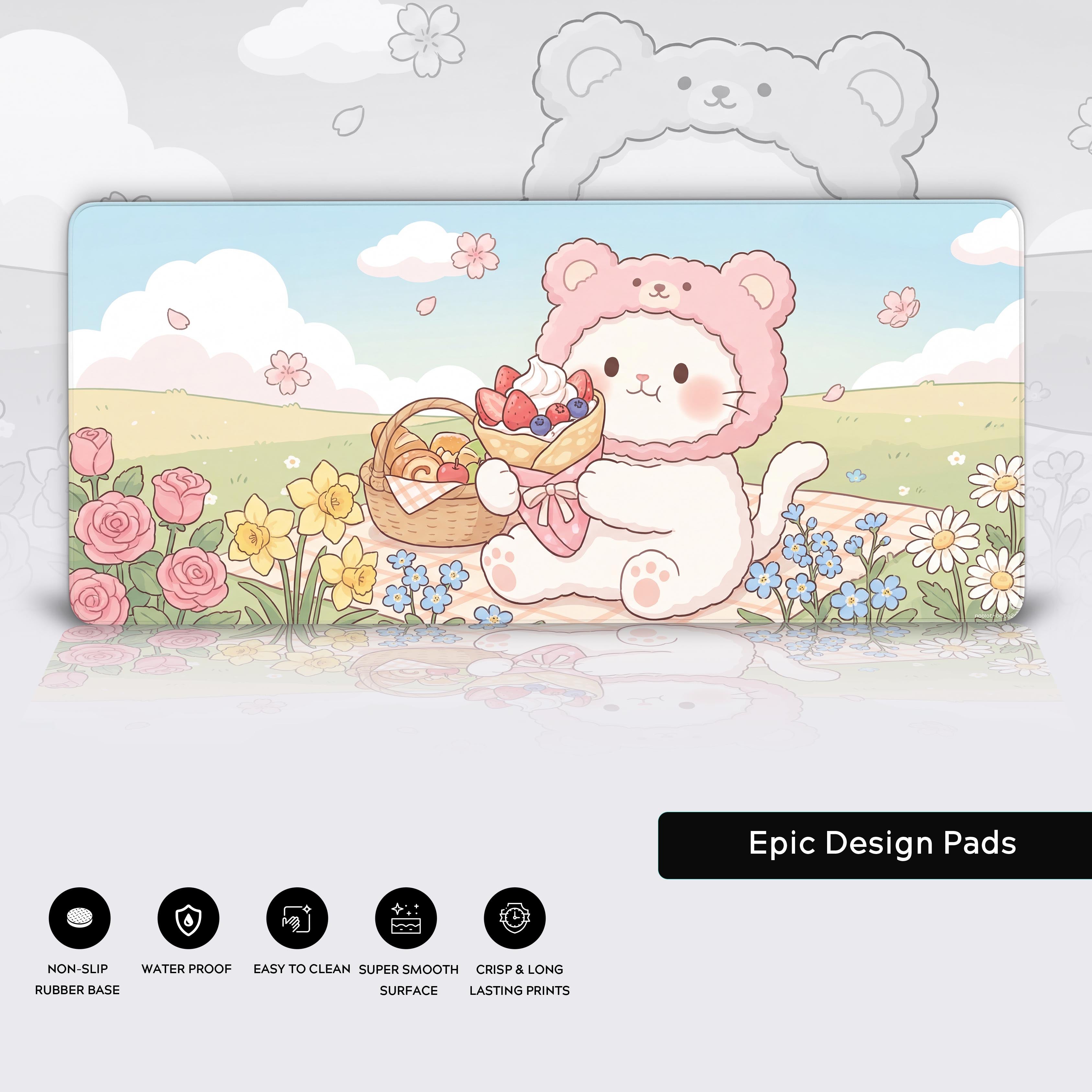 Transform your workspace into a peaceful sanctuary with the Sweet Spring Picnic desk mat. This charming design features an adorable cat in a cozy bear hood, enjoying a sweet treat in a field of blooming flowers. It’s a gentle reminder to embrace simple pleasures and find joy in the present moment.