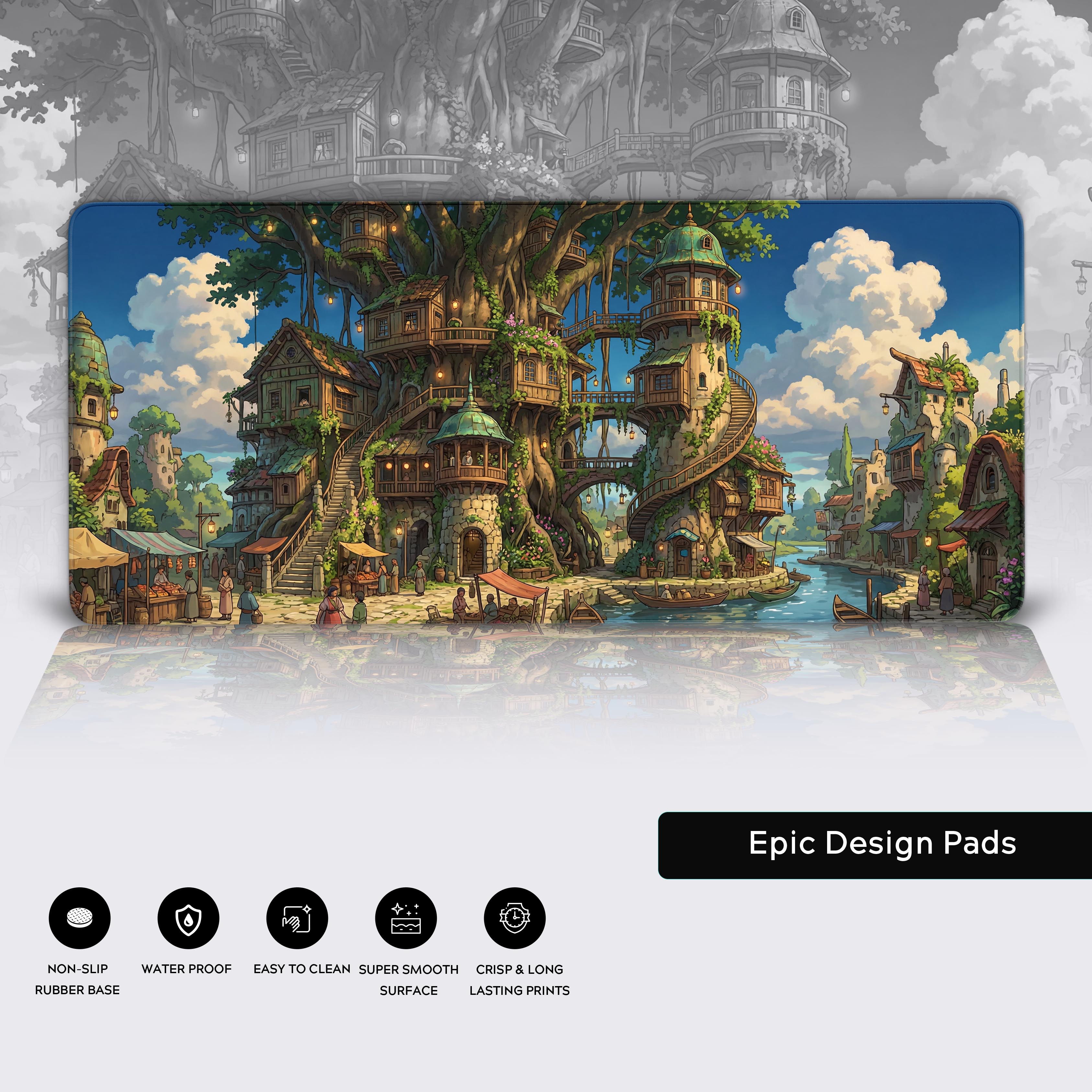 Escape the digital noise and ground your workspace in a world of purposeful peace. The Sylvan Heights desk mat transforms your desk into a vision of harmony, depicting a civilization that grew with nature, not over it. Lose yourself in the intricate wooden architecture spiraling up a colossal, ancient tree, while a gentle river flows past a bustling, sunlit market below.