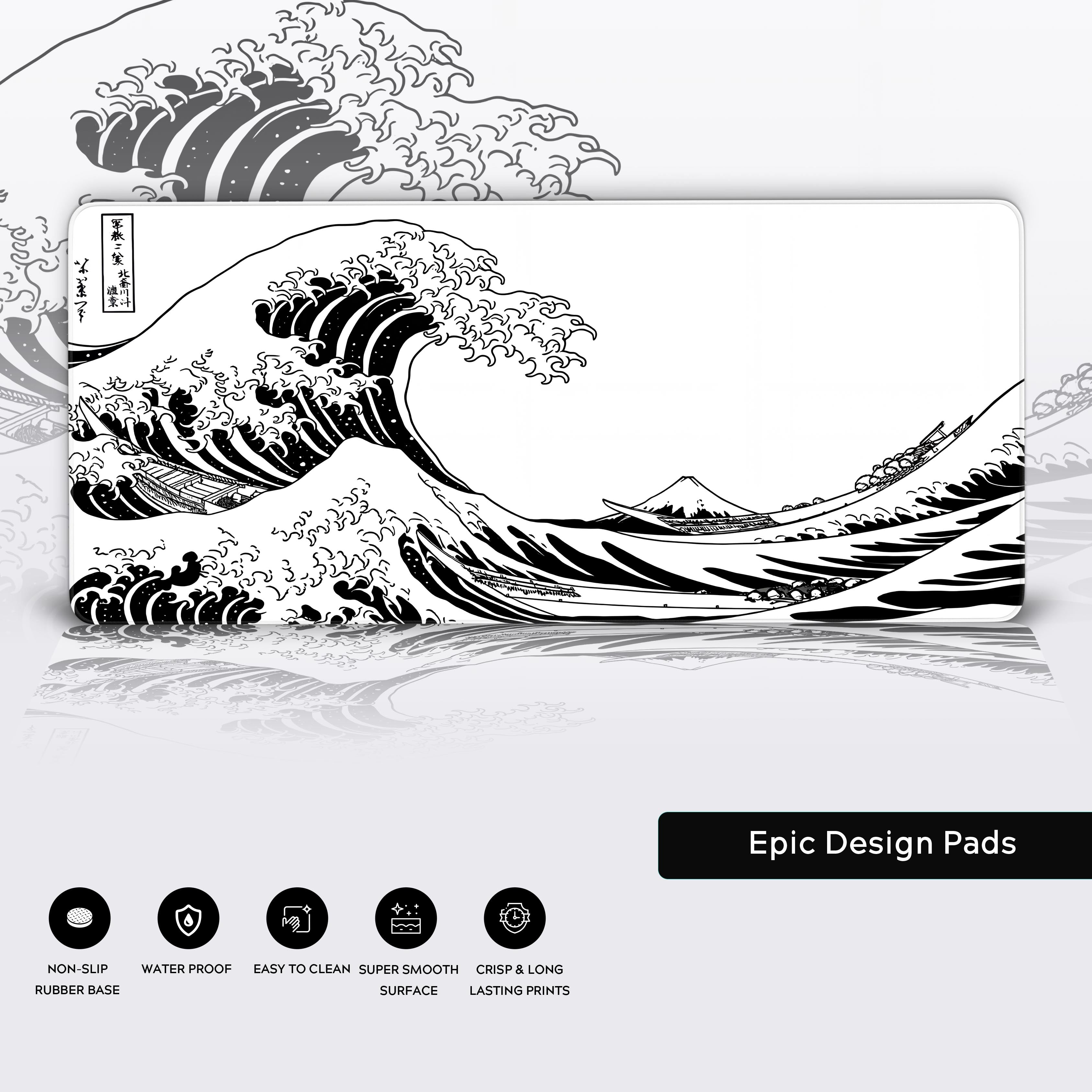This isn't just a desk mat; it's a statement. "The Great Wave off Kanagawa", reimagined in stark black and white, forces you to confront the chaos of your work. The pure white canvas represents total clarity, while the crushing black waves embody the challenges you conquer daily. In the distance, Mount Fuji stands as a symbol of your unshakeable discipline.