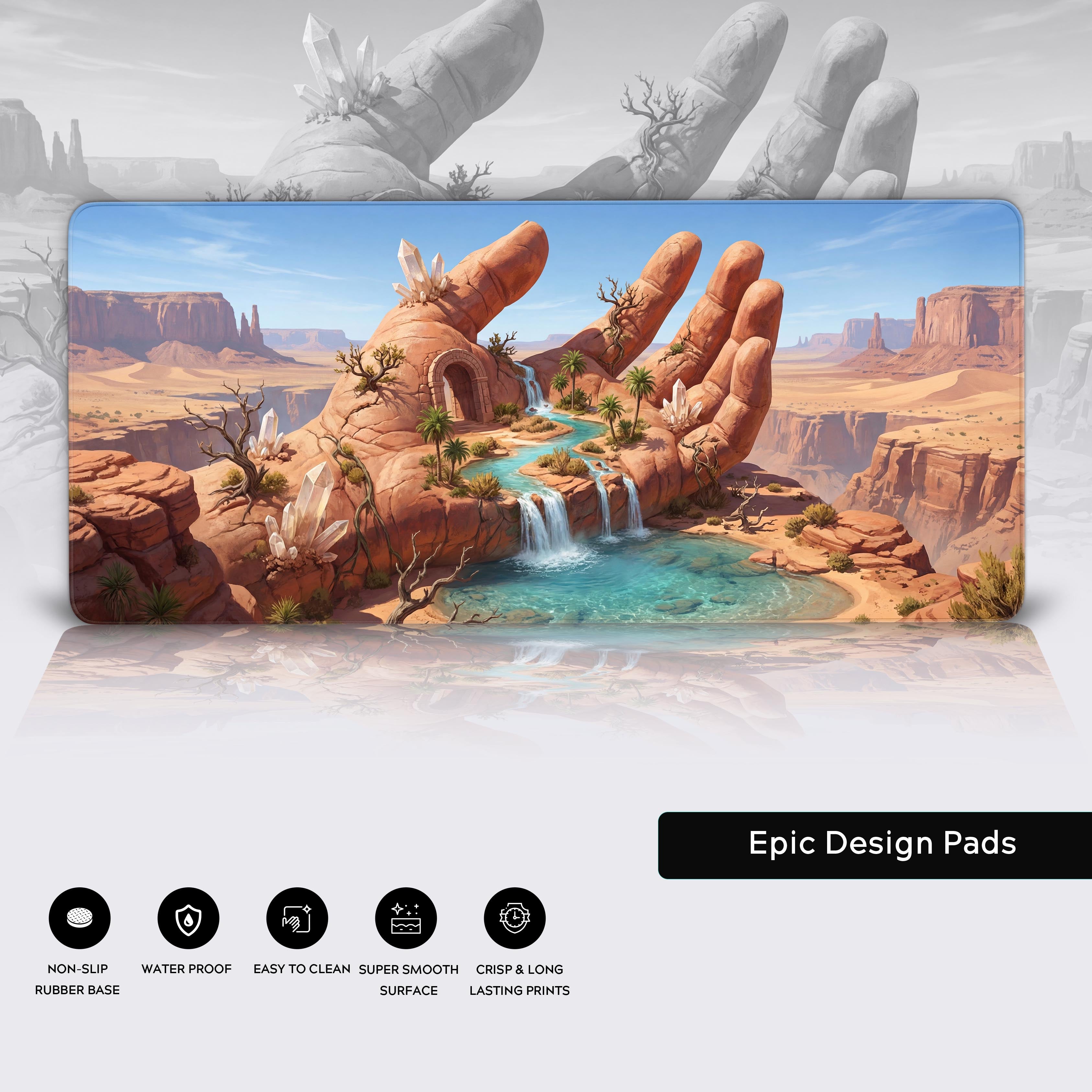 In a world of endless tasks, find your sanctuary with The Keeper's Palm desk mat. This stunning design depicts a colossal stone hand cradling a vibrant oasis in a vast, sun-scorched desert. Witness crystal-clear water cascading through its fingers, nurturing life in the harshest of environments—a powerful symbol of protection and resilience.