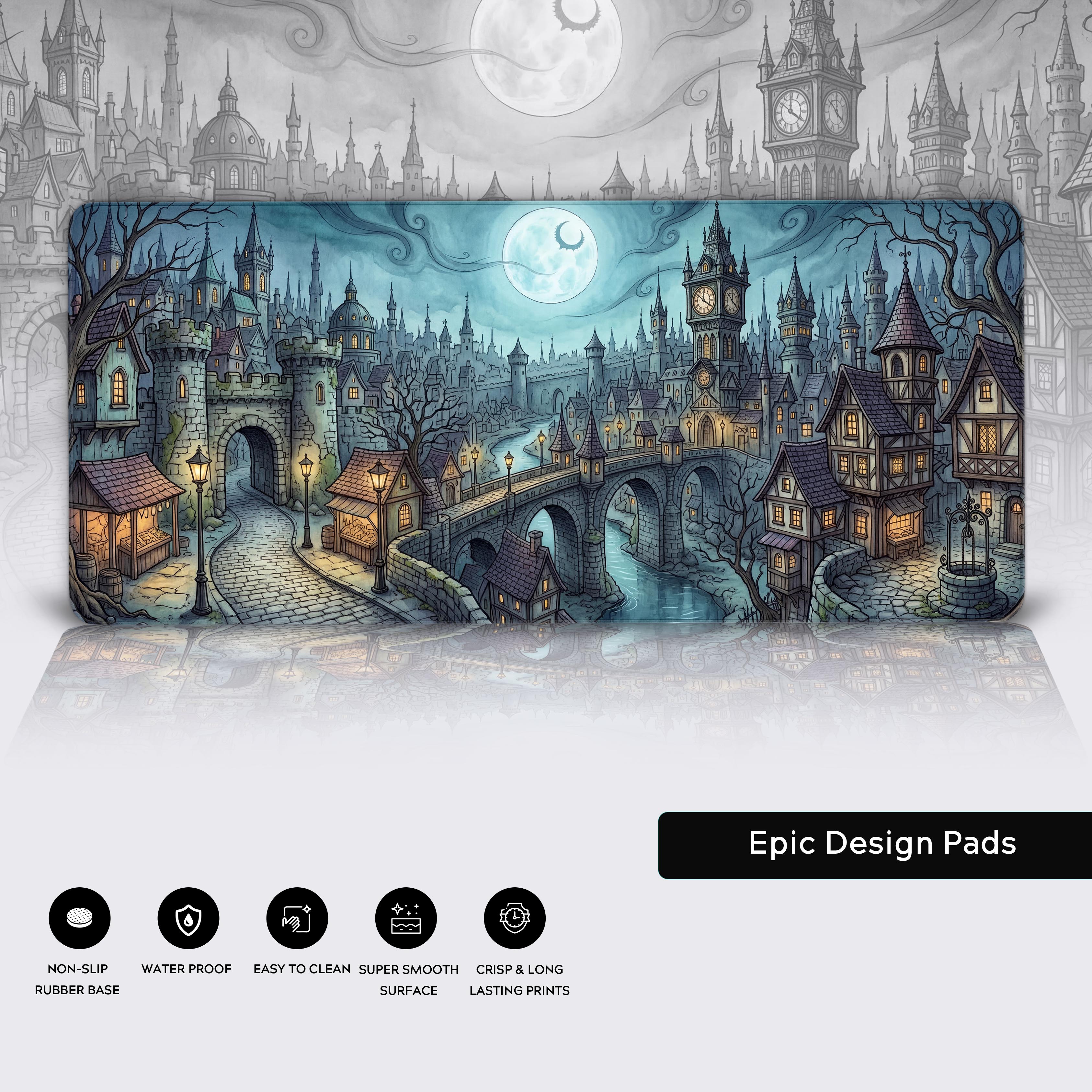 Why work on a blank canvas when your desk could be a moonlit medieval borough? The Twilight Hollow desk mat transforms your space into a sprawling, fantasy cityscape, where the only things awake are the glowing windows and your own ambition. The cool lunar teal and warm, golden lantern light create a hypnotic depth, perfect for late-night strategizing.