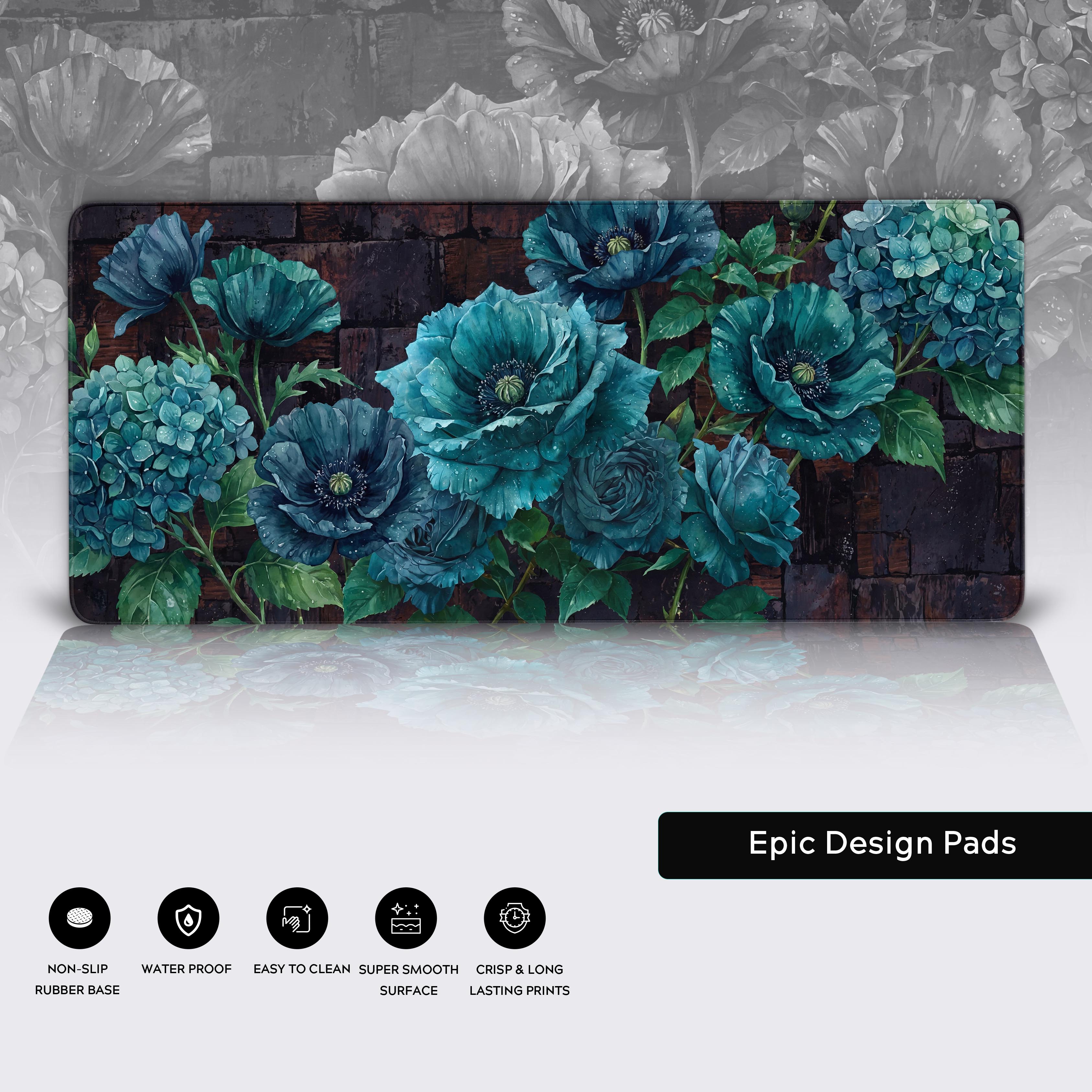 Transform your desk into a serene, midnight garden with the Velvet Bloom desk mat. It showcases stunning deep indigo poppies and hydrangeas against a dark, weathered backdrop, bringing a touch of melancholic elegance to your workspace.