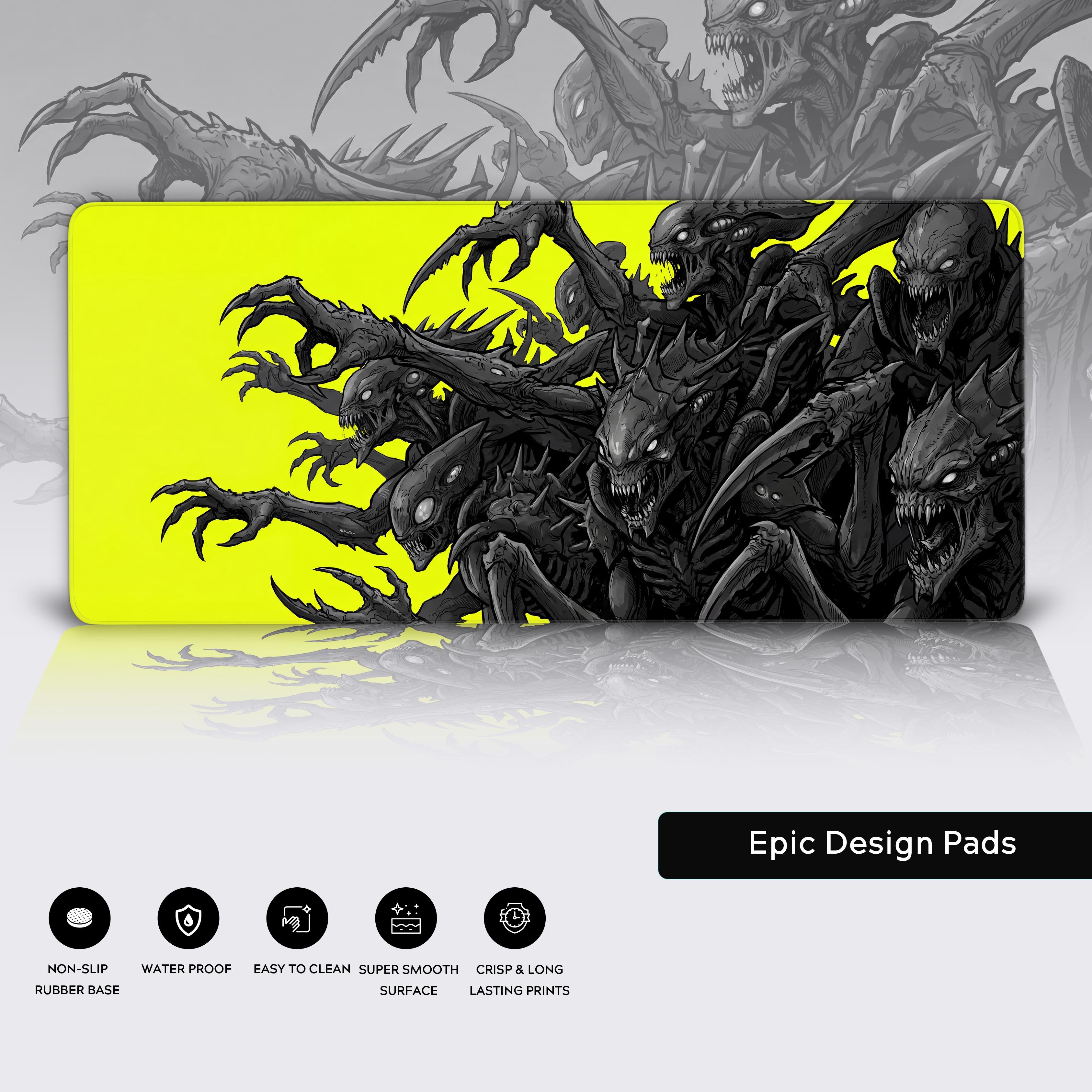 This isn't just a desk mat; it's a statement. The Void Hunters design captures raw, predatory energy with a swarm of biomechanical creatures set against a hazard-yellow background. It’s loud, hostile, and designed for the relentless operator who thrives on pressure and approaches every goal with a singular, swarm-like focus.