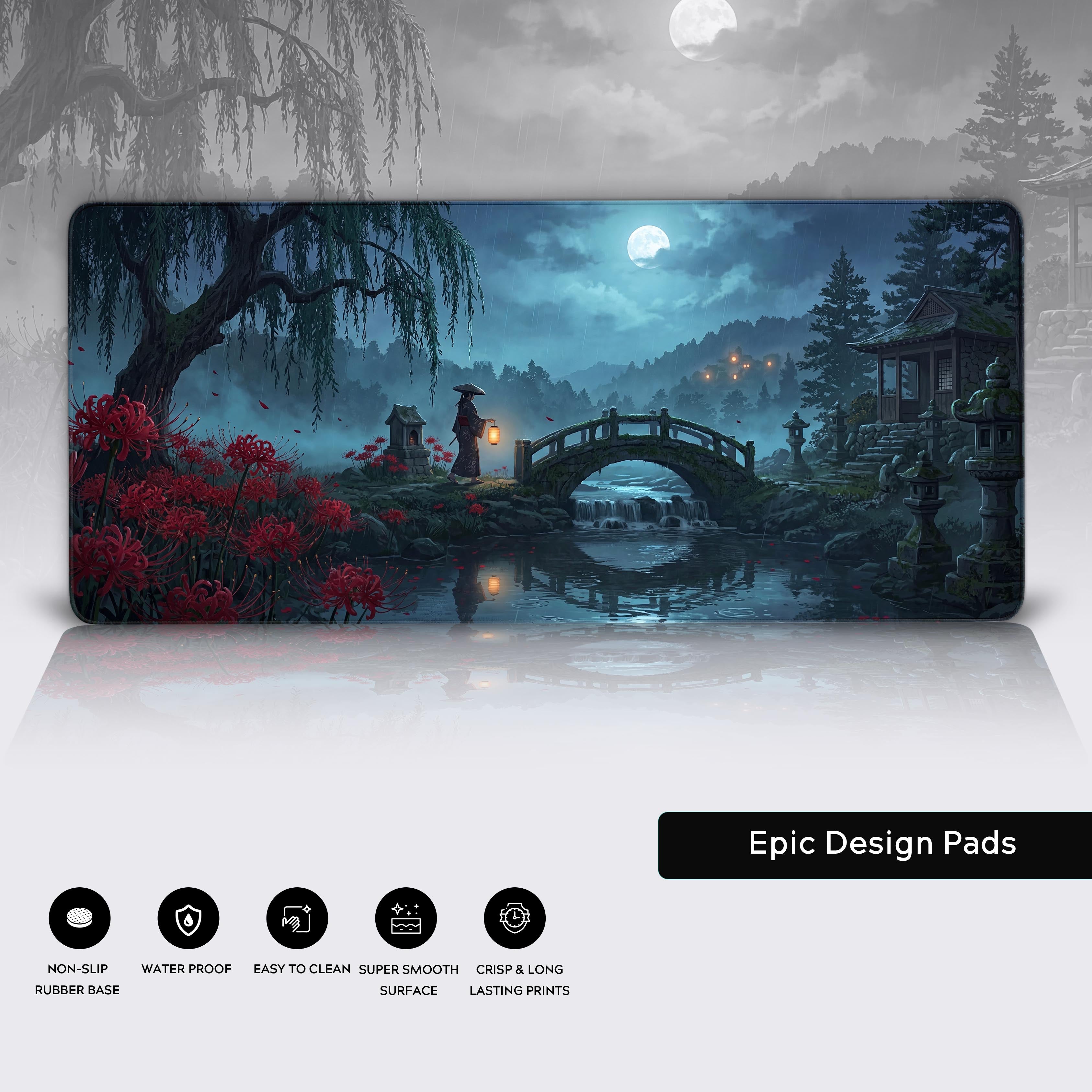 Transform your desk into a serene, midnight sanctuary. The Weeping Willow desk mat captures the quiet intensity of a rain-soaked Japanese garden, illuminated by a full moon and the striking crimson of spider lilies. This atmospheric design is crafted for deep focus and uninterrupted immersion.