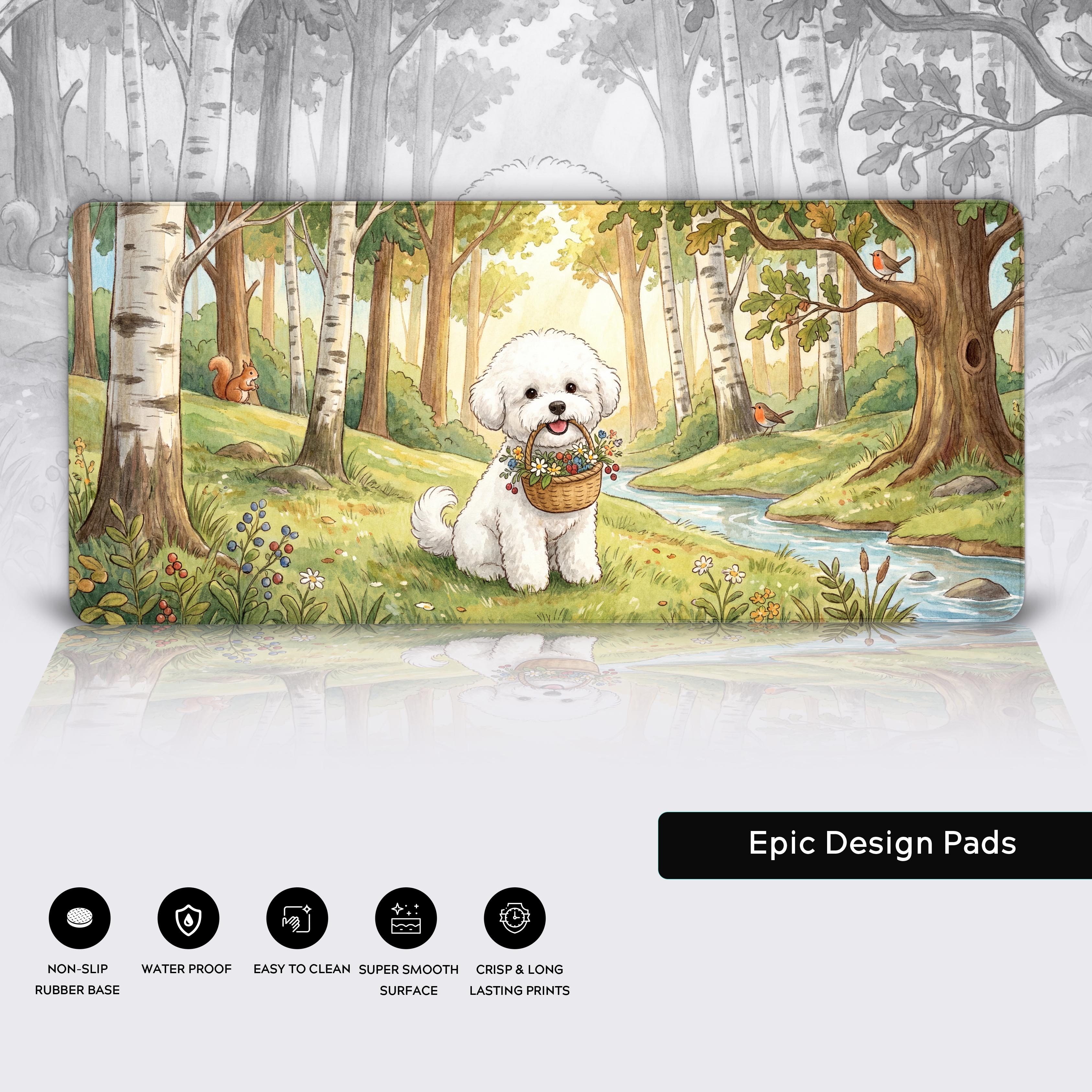 Transform your workspace into a tranquil woodland sanctuary with the "Woodland Greeting" desk mat. This enchanting watercolor scene features a cheerful puppy offering a basket of wildflowers, a pure gesture of kindness to brighten your day.