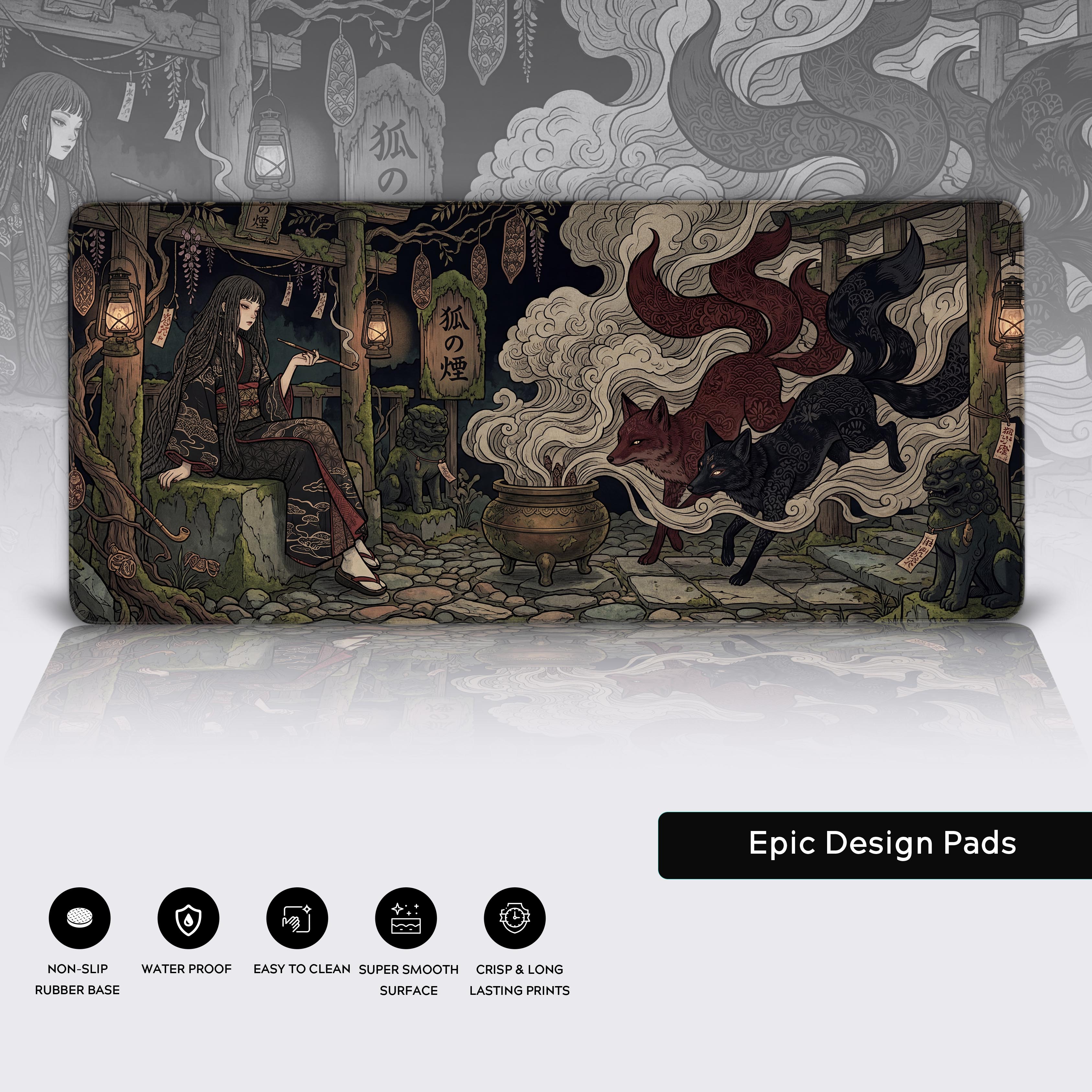 Step into the spirit realm with the Yokai Incense desk mat. This stunning design captures a tranquil temple scene where burning incense breathes life into twin, multi-tailed kitsune. The intricate, ukiyo-e inspired linework and muted, earthy tones ground your workspace in ancient folklore, creating an atmosphere of quiet, supernatural power.